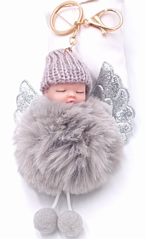 Brelok dzidziuś z brokatowymi skrzydełkami i wełnianą czapeczką – Szary, praktyczny dodatek