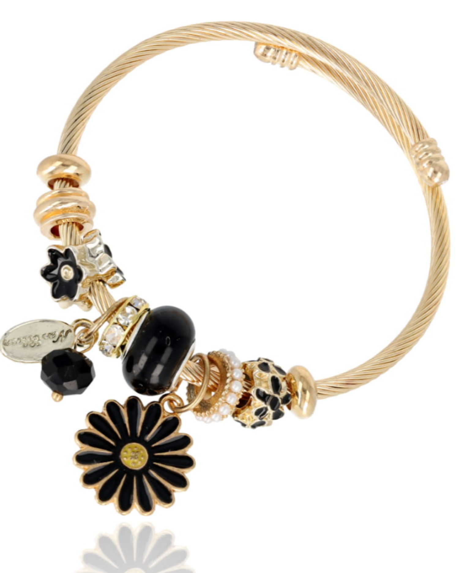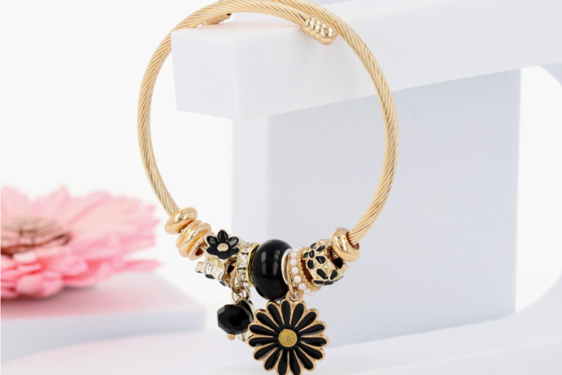 Bransoletka bangle z czarnymi zawieszkami i motywem słonecznika – połączenie elegancji i symboliki