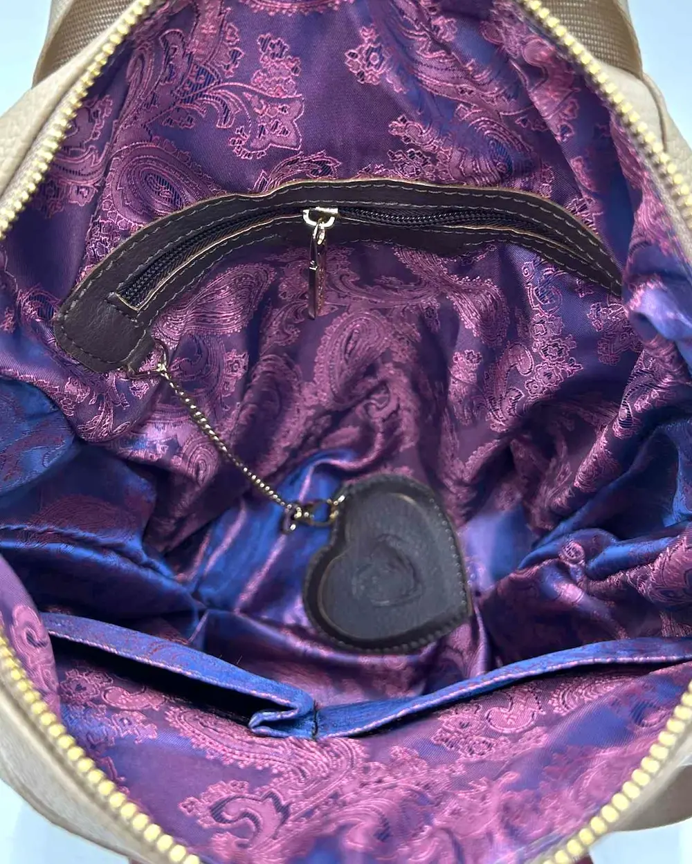 Wnętrze wykończono elegancką, wzorzystą podszewką oraz wyposażono w praktyczne przegródki – jedną zamykaną na suwak i dwie otwarte. Kobiecym detalem jest małe lustereczko w kształcie serduszka, zawieszone na łańcuszku – praktyczny gadżet, który zawsze warto mieć przy sobie.