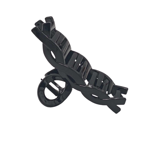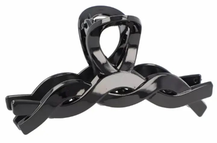 Czarna spinka klamra do włosów z delikatnym połyskiem i formą przypominającą zapleciony warkocz to połączenie klasycznego stylu i funkcjonalności. Jej elegancki kształt nadaje fryzurze wyjątkowy charakter, a solidna konstrukcja gwarantuje pewne i trwałe podpięcie włosów.