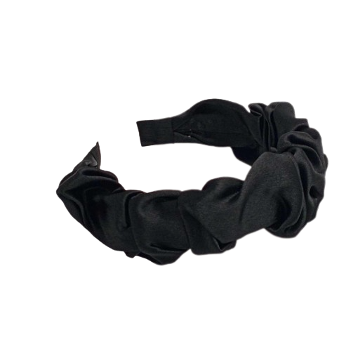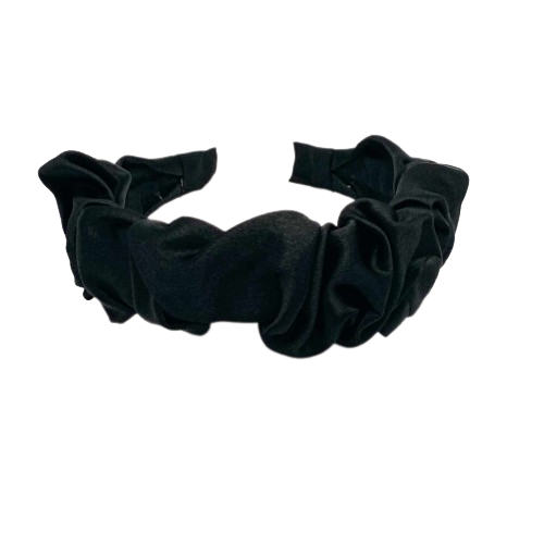 Czarna opaska do włosów z połyskiem to elegancki dodatek, który podkreśli każdą fryzurę. Wykonana na lekkiej, plastikowej bazie i starannie obleczona czarnym, marszczonym materiałem o subtelnym, satynowym połysku.