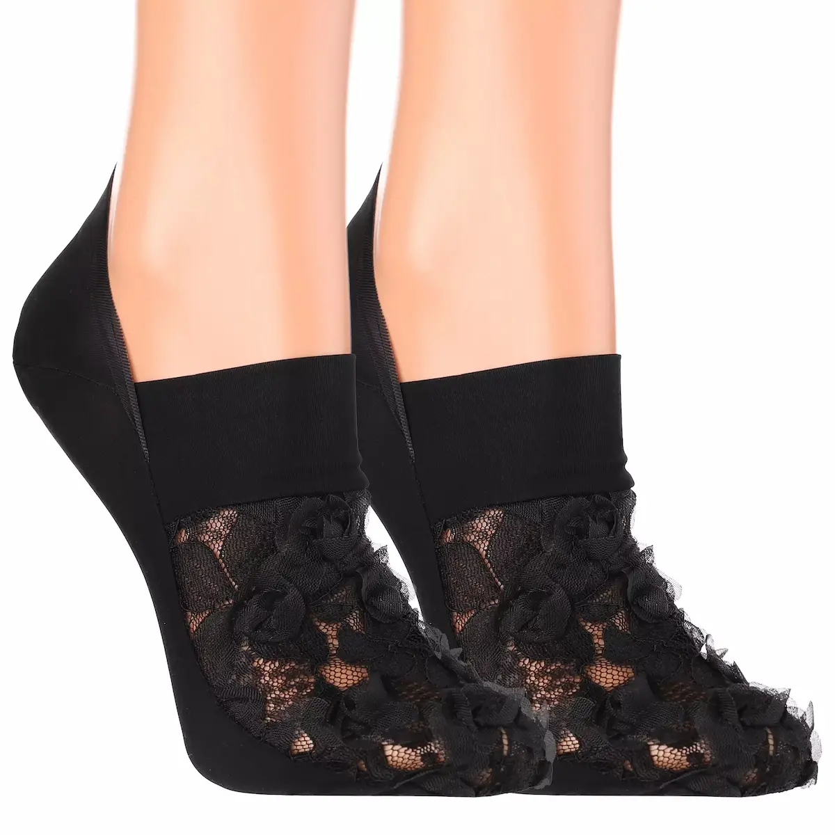Przód zdobi subtelna koronka z trójwymiarowym kwiatowym wzorem, która prezentuje się niezwykle kobieco i szykownie. Dzięki silikonowemu wykończeniu na pięcie stopki nie zsuwają się podczas noszenia, a antypoślizgowa podeszwa zapewnia bezpieczeństwo i komfort krok po kroku.