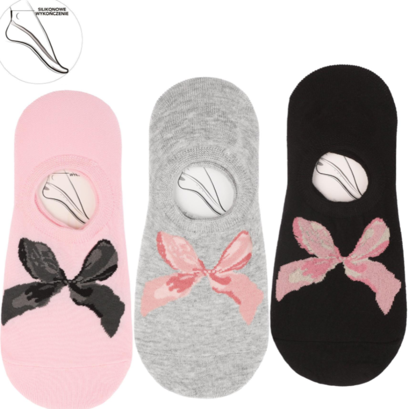 Postaw na wygodę i kobiecy styl z zestawem trzech par niskich skarpetek damskich typu stopki z ozdobną kokardką. Ten uroczy 3-pak łączy funkcjonalność z wyjątkowym designem – każda para to inny kolor: pudrowy róż, klasyczna czerń i ponadczasowy szary melanż, dzięki czemu świetnie dopasują się do wielu stylizacji.