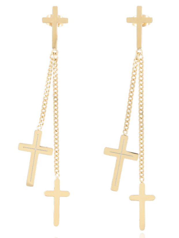 Te lekkie, złote kolczyki wkrętki to połączenie subtelnej formy i wyrazistego detalu. Krzyżyki zawieszone na cienkim łańcuszku poruszają się przy każdym ruchu, przyciągając wzrok i nadając stylizacji nowoczesnego charakteru.