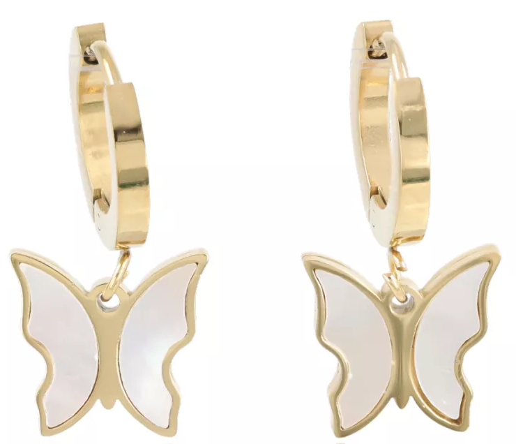 Kolczyki wiszące z motylkiem i masą perłową – złote, stal chirurgiczna