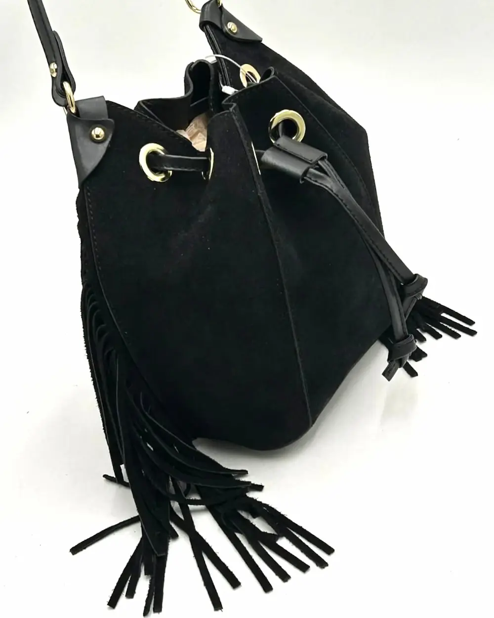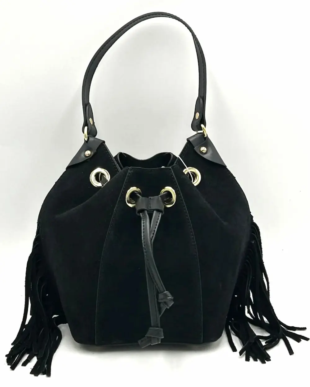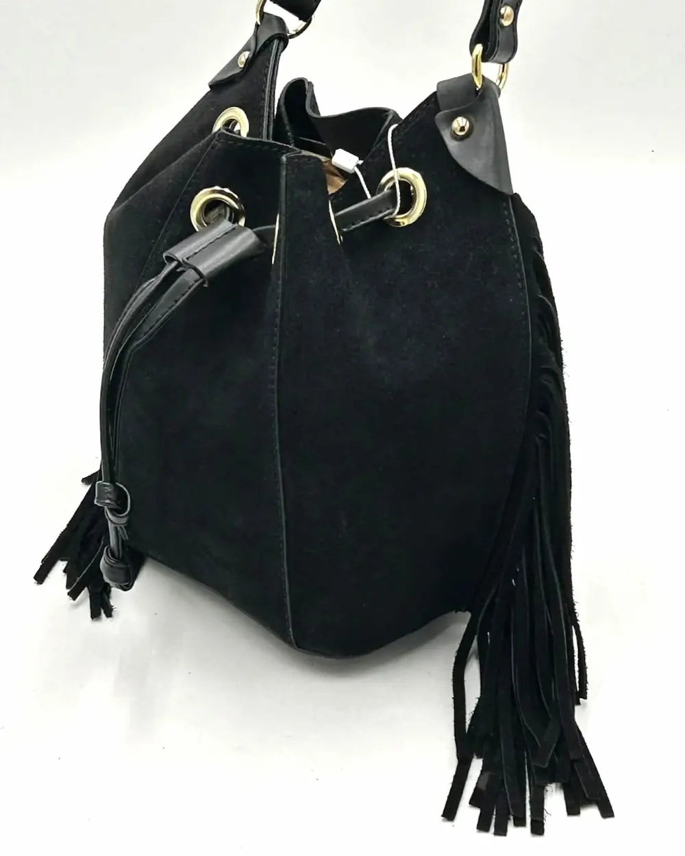 Laura Biaggi – czarna torebka worek z naturalnego zamszu z frędzlami