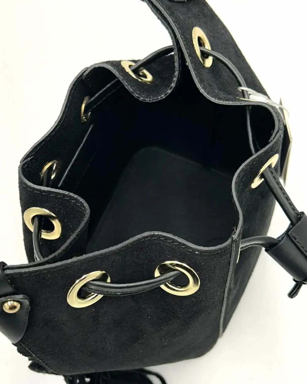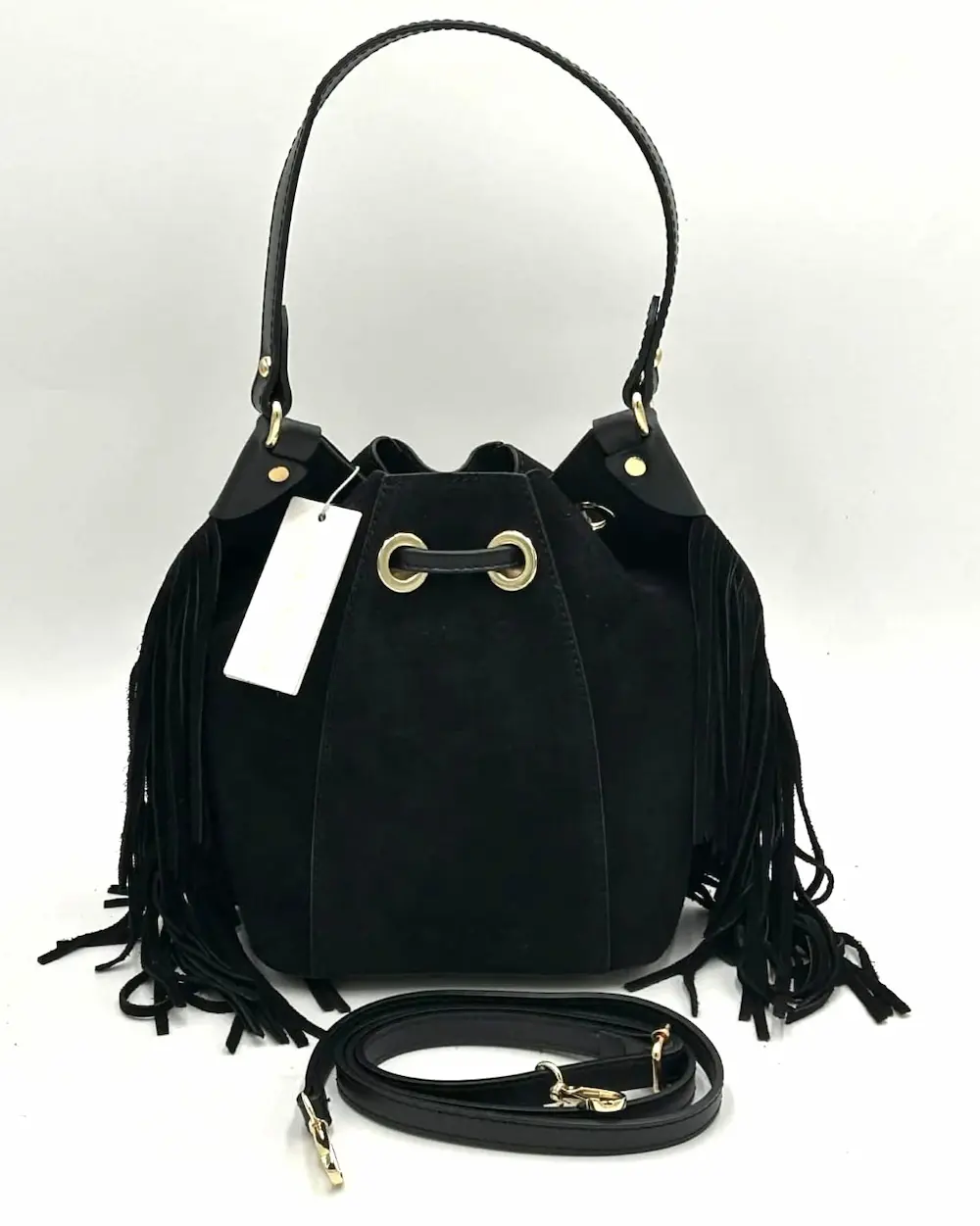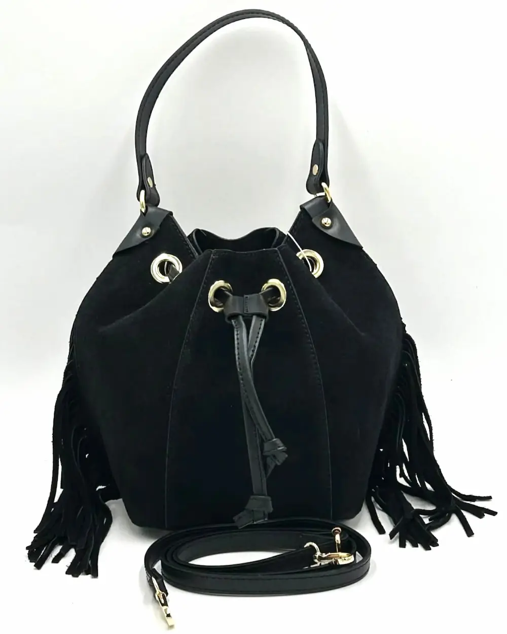 Laura Biaggi – czarna torebka worek z naturalnego zamszu z frędzlami