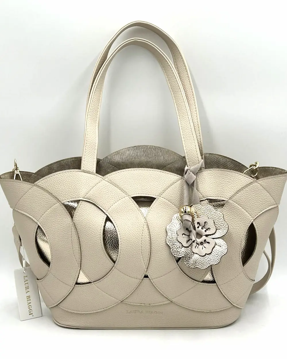 Laura Biaggi damska torebka beżowa shopper na ramię ażurowa elegancka