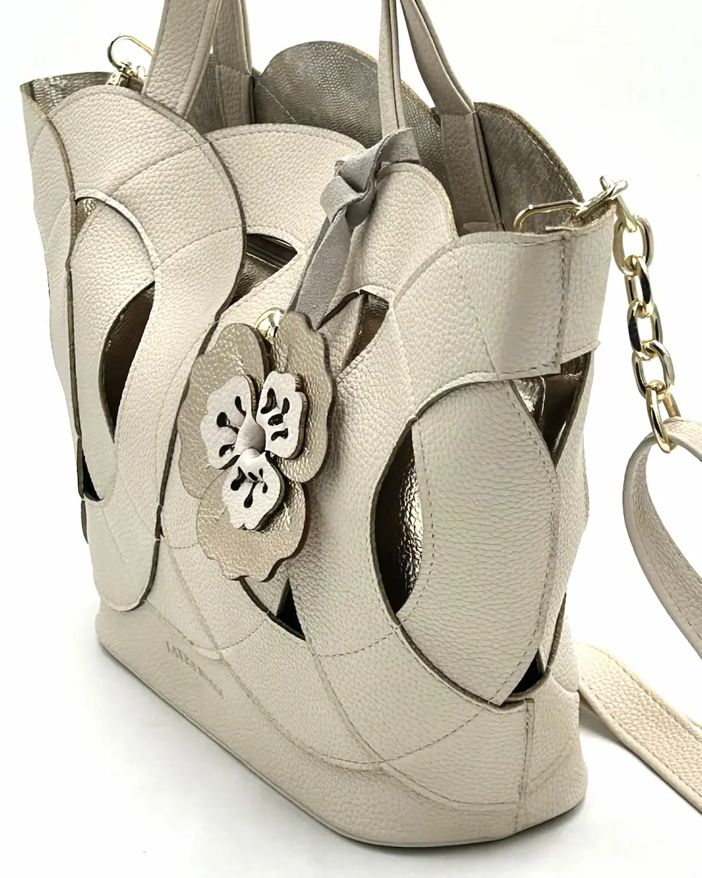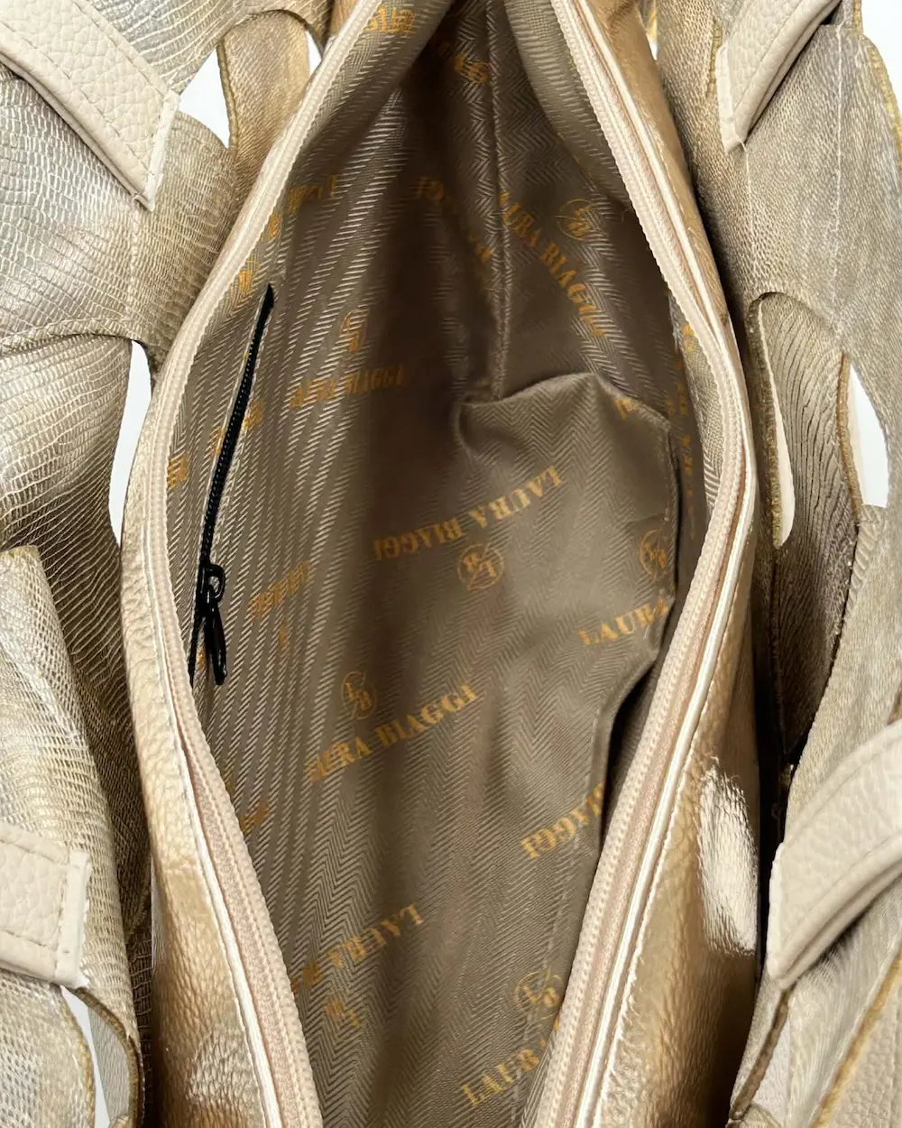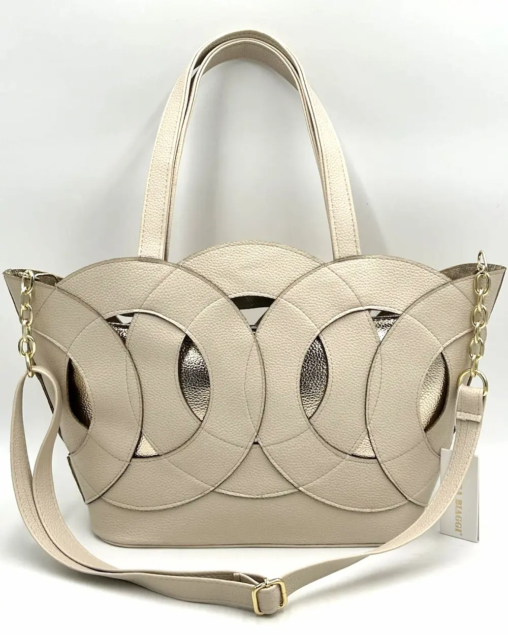Ta wyjątkowa torebka Laura Biaggi przyciąga uwagę swoim niepowtarzalnym designem. Połączenie klasycznego beżu ze złotymi akcentami oraz oryginalnym wzorem nadaje jej luksusowego charakteru.