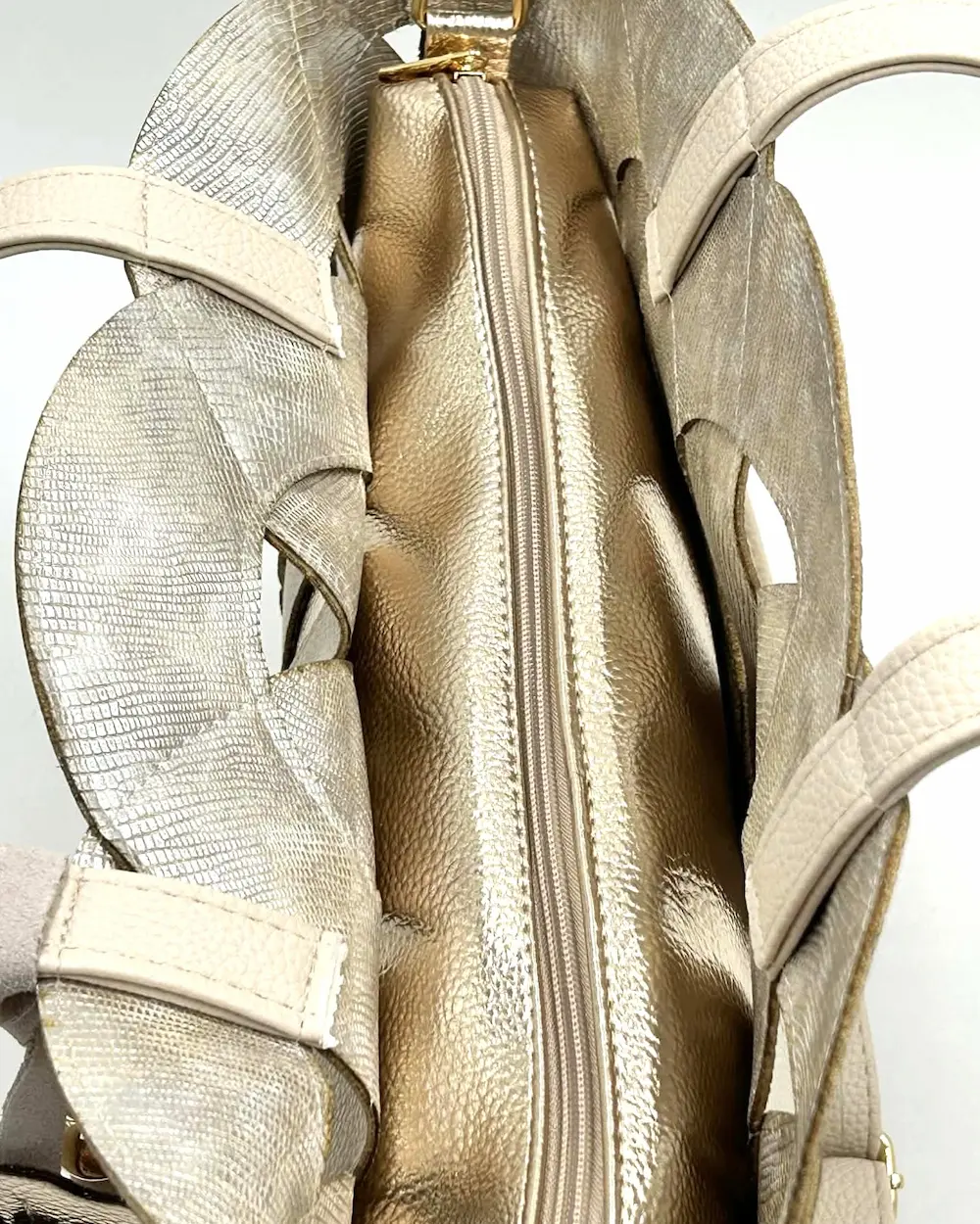 Wnętrze torebki zostało wyposażone w wyjmowany organizer w złotym kolorze, zamykany na suwak.