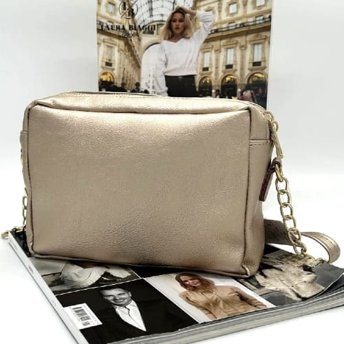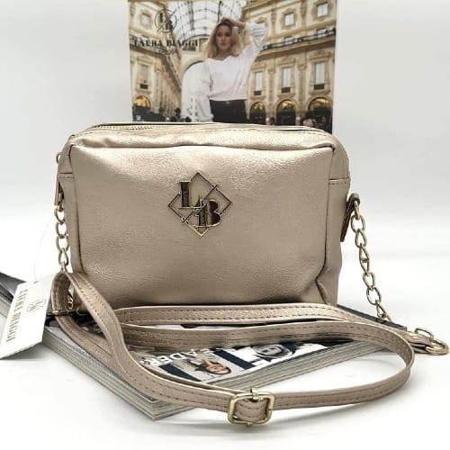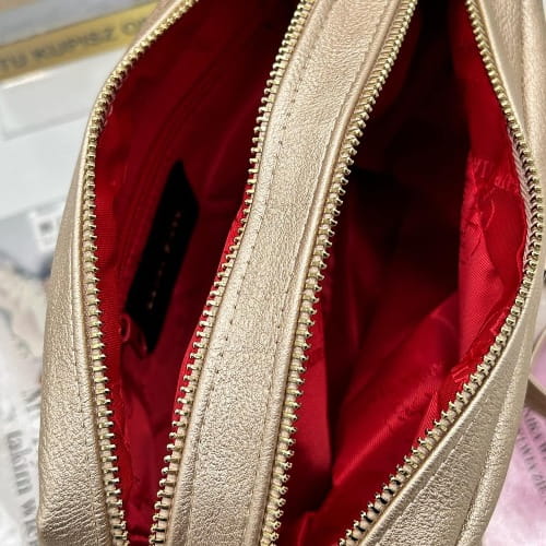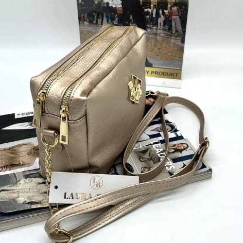 Postaw na modę, która przyciąga spojrzenia – złota torebka kuferek od Laura Biaggi to połączenie elegancji z nowoczesną funkcjonalnością. Ten efektowny model wyróżnia się pięknym kolorem, biżuteryjnym logo na przodzie oraz dopracowanym wnętrzem, które zostało wykończone czerwoną, logowaną podszewką.