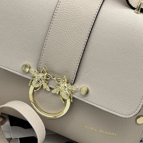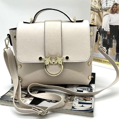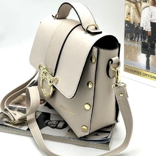 Stylowa i nietuzinkowa – taka jest torebka Laura Biaggi w kształcie eleganckiego kuferka w modnym odcieniu jasnego beżu. Ten model przyciąga uwagę ozdobną klapką z magnetycznym zatrzaskiem, którą zdobi biżuteryjne logo marki i motyw much – subtelny detal, który wyróżnia torebkę spośród innych i dodaje jej unikalnego charakteru.