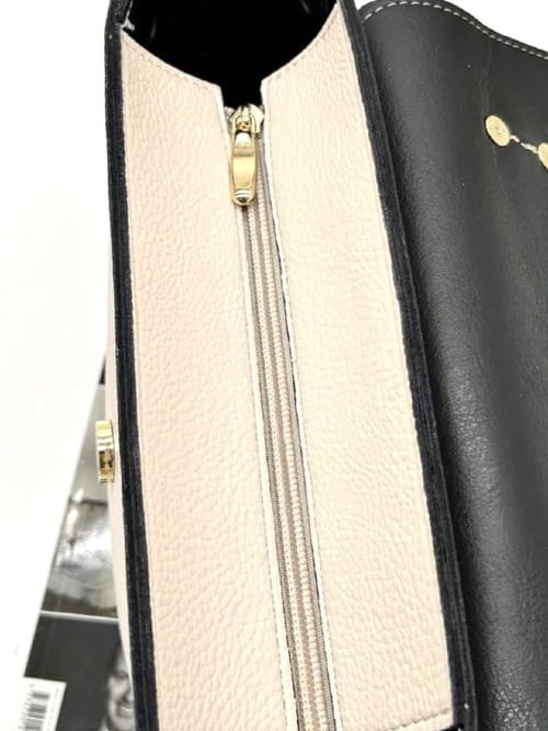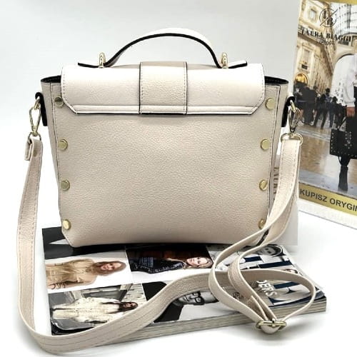 Pod klapką znajduje się dodatkowe zabezpieczenie w postaci zamka błyskawicznego, dzięki któremu Twoje rzeczy będą jeszcze lepiej chronione. Po bokach kuferka subtelnie rozmieszczone są złote ćwieki, które dodają lekko rockowego, a jednocześnie eleganckiego akcentu. Tył torebki pozostaje gładki, dzięki czemu całość prezentuje się spójnie i szykownie.