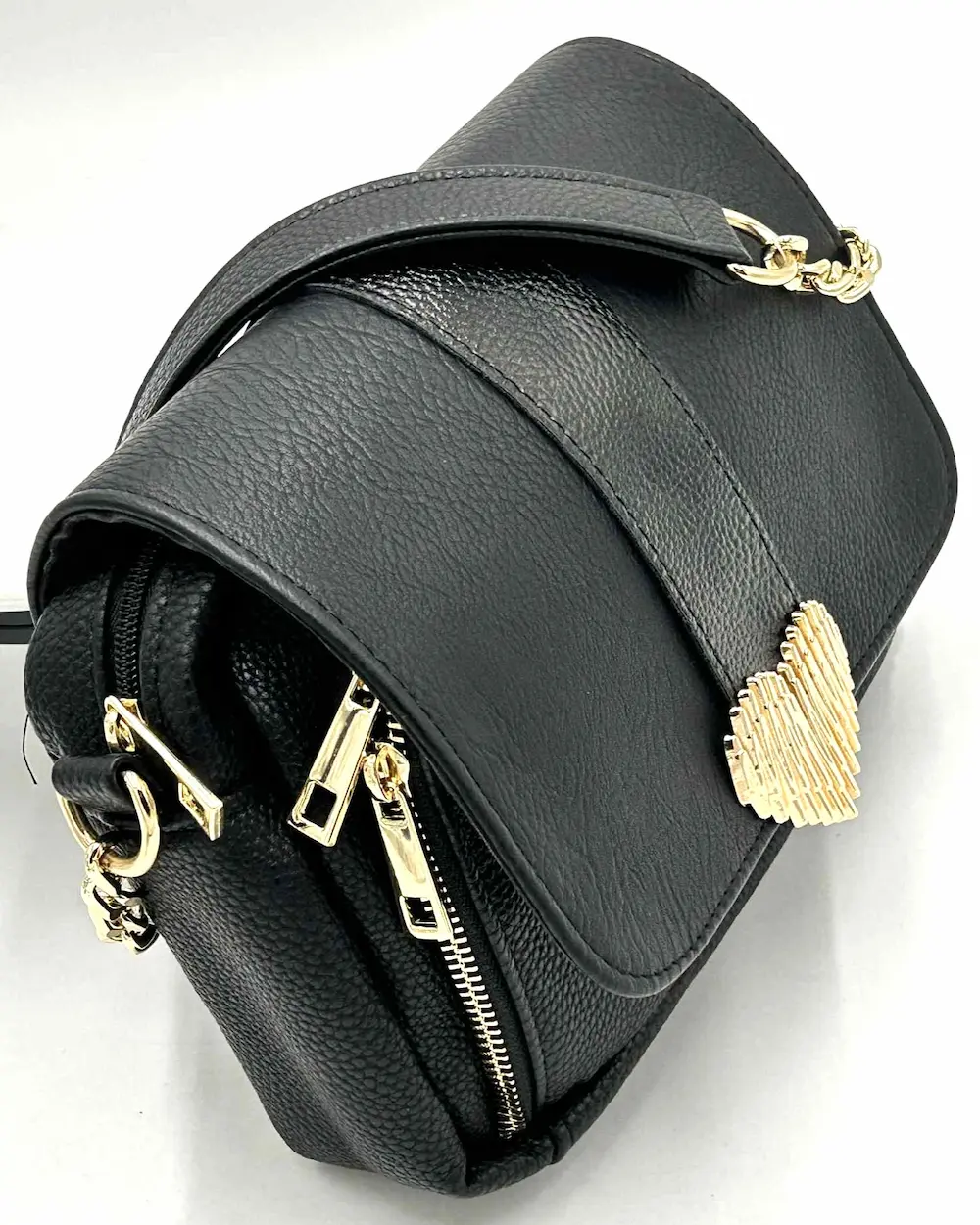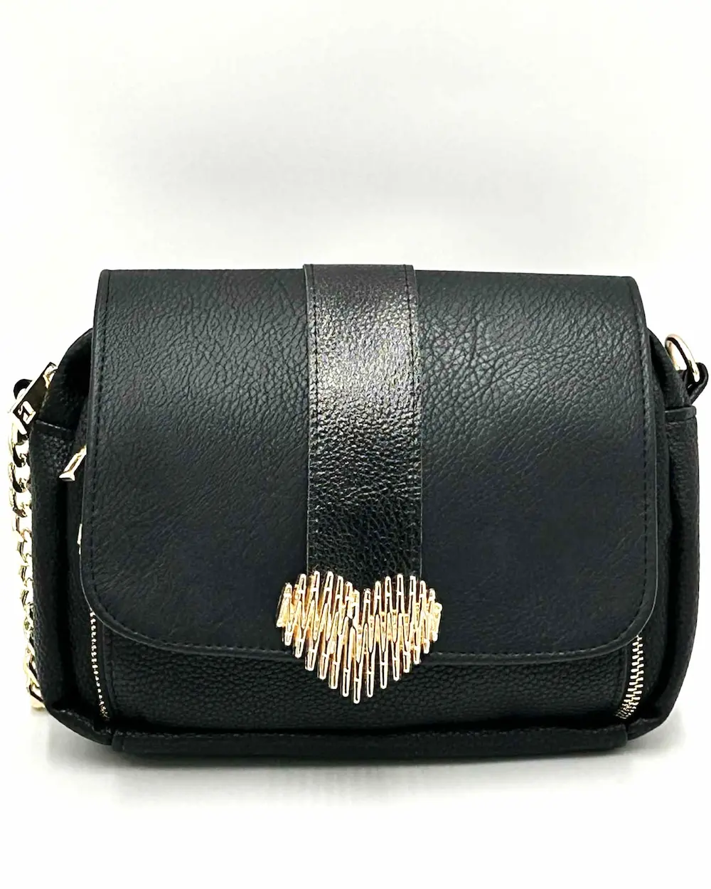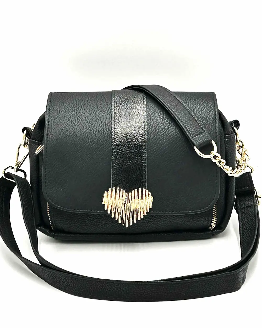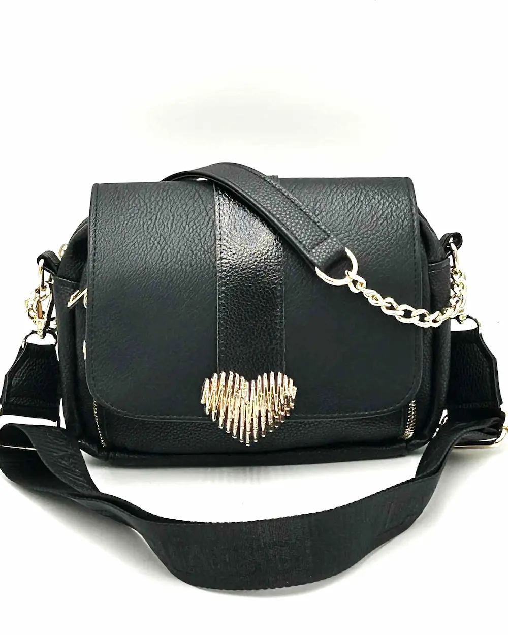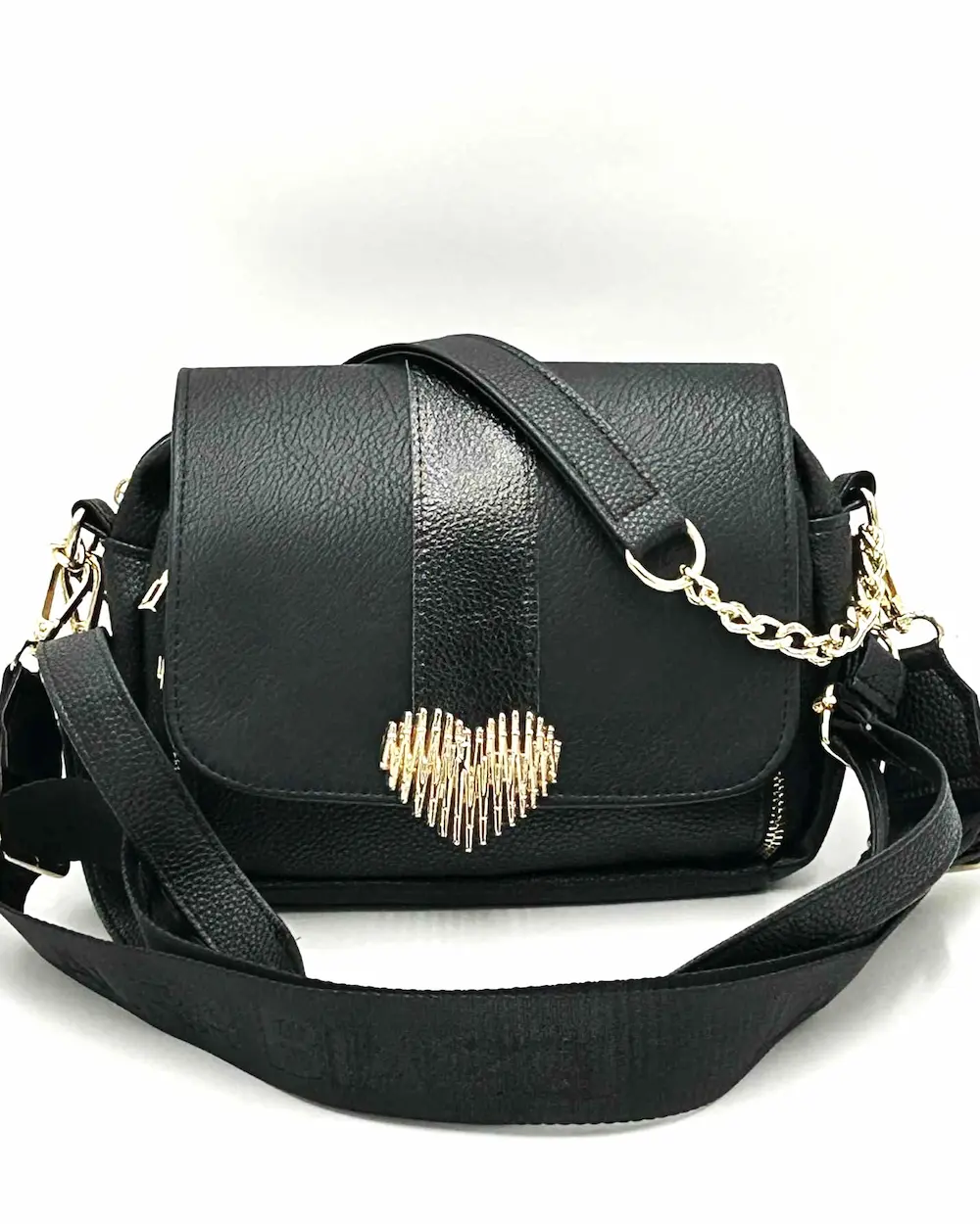 Na przodzie torebki znajduje się charakterystyczne złote serduszko – delikatny biżuteryjny akcent, który dodaje całości kobiecego uroku. W zestawie znajdziesz uchwyt ze skóry ekologicznej połączony ze złotym łańcuszkiem (52 cm) oraz dwa dopinane paski z regulacją – jeden gładki ze skóry ekologicznej, drugi tkany, logowany. Dzięki nim możesz nosić torebkę zarówno elegancko, jak i w bardziej casualowym stylu.