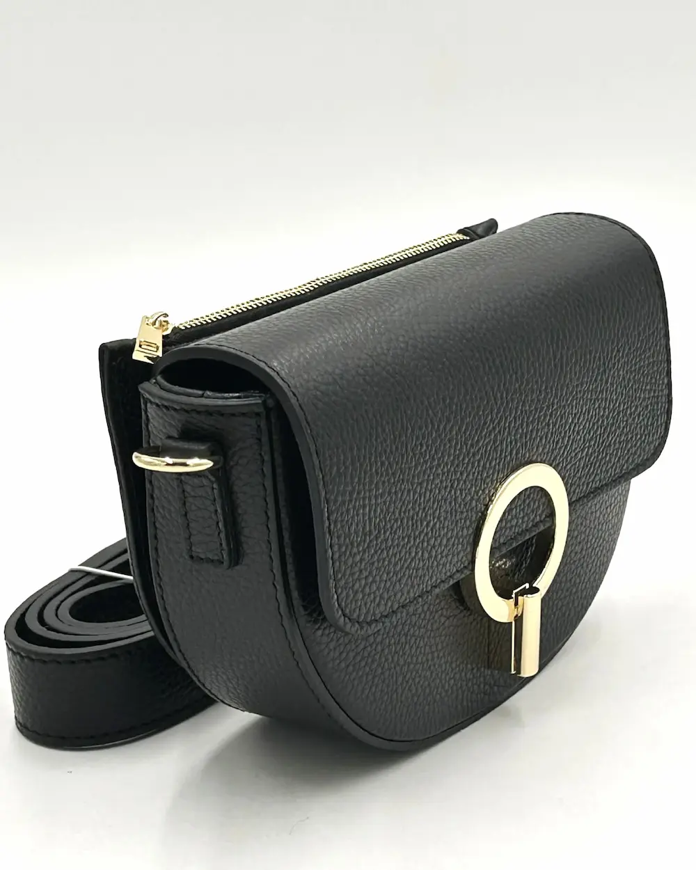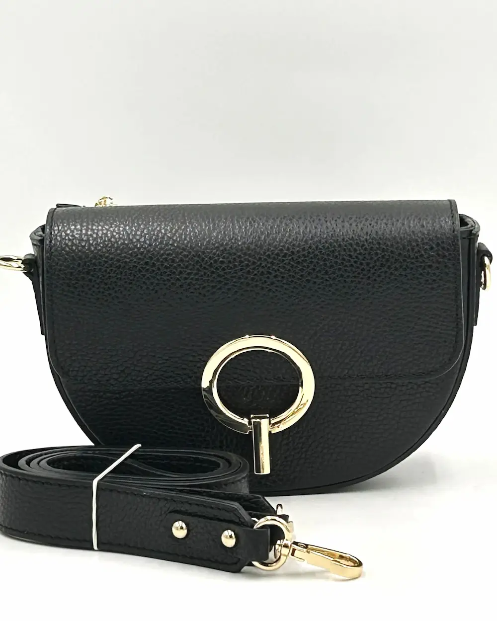 Torebka zamykana jest na klapkę z efektownym, złotym elementem dekoracyjnym. Dzięki temu: