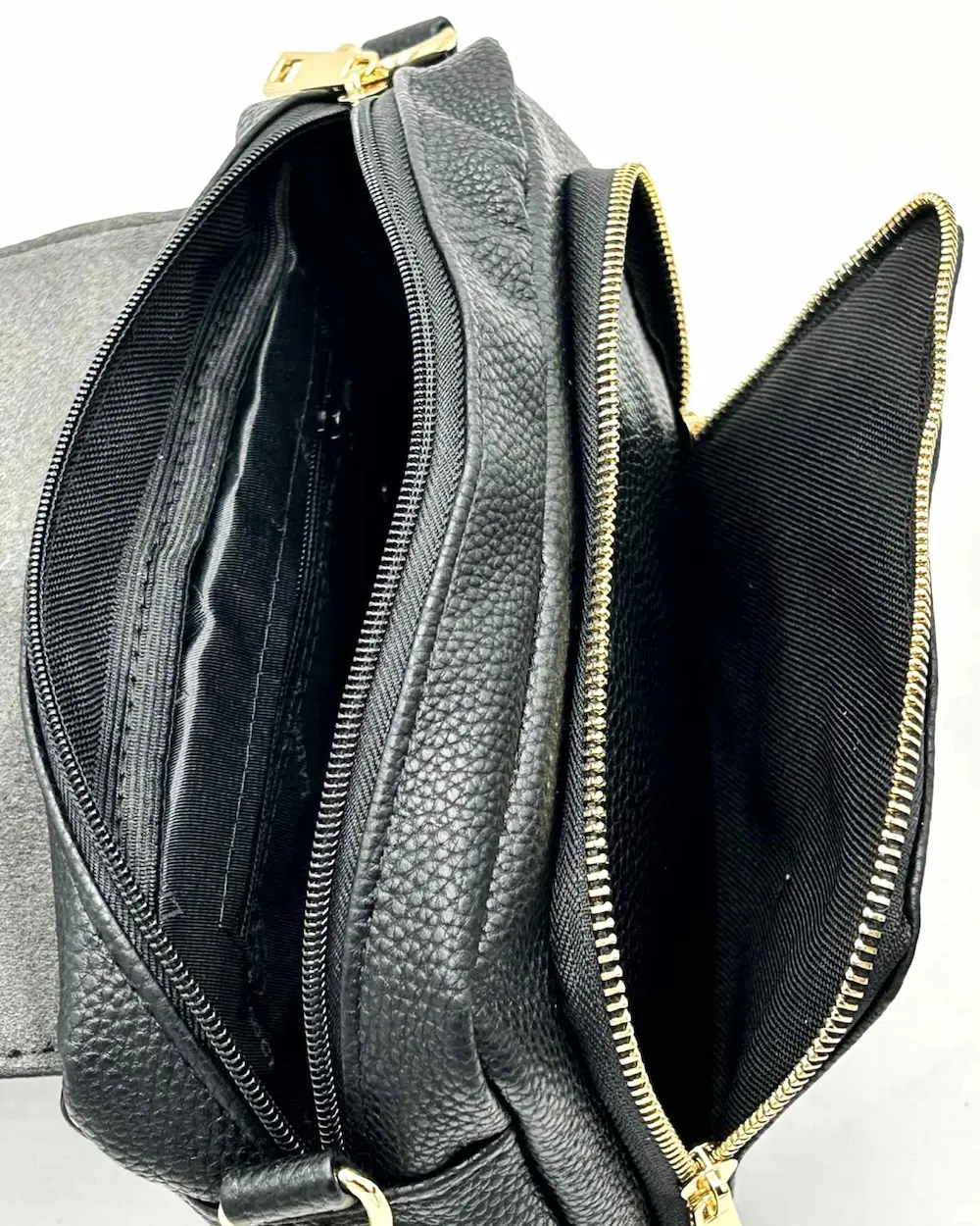 Wnętrze torebki zostało wykończone czarną podszewką, a w środku znajdują się: