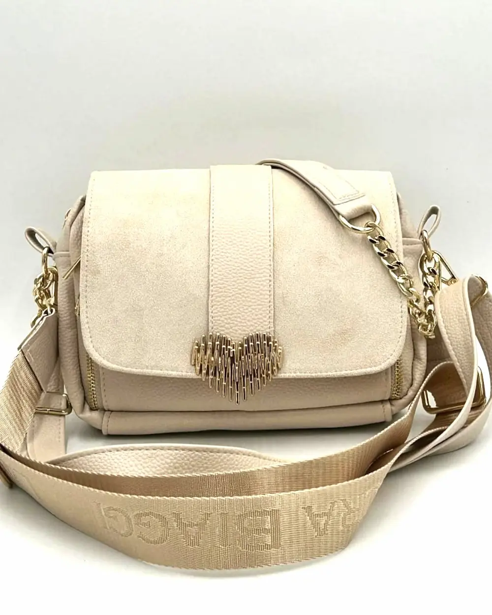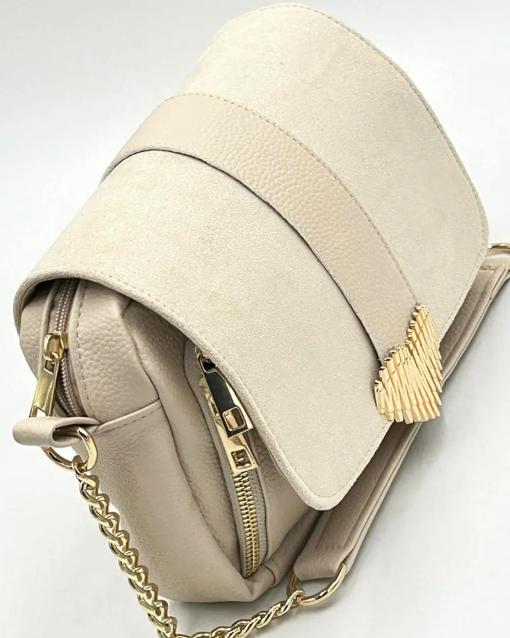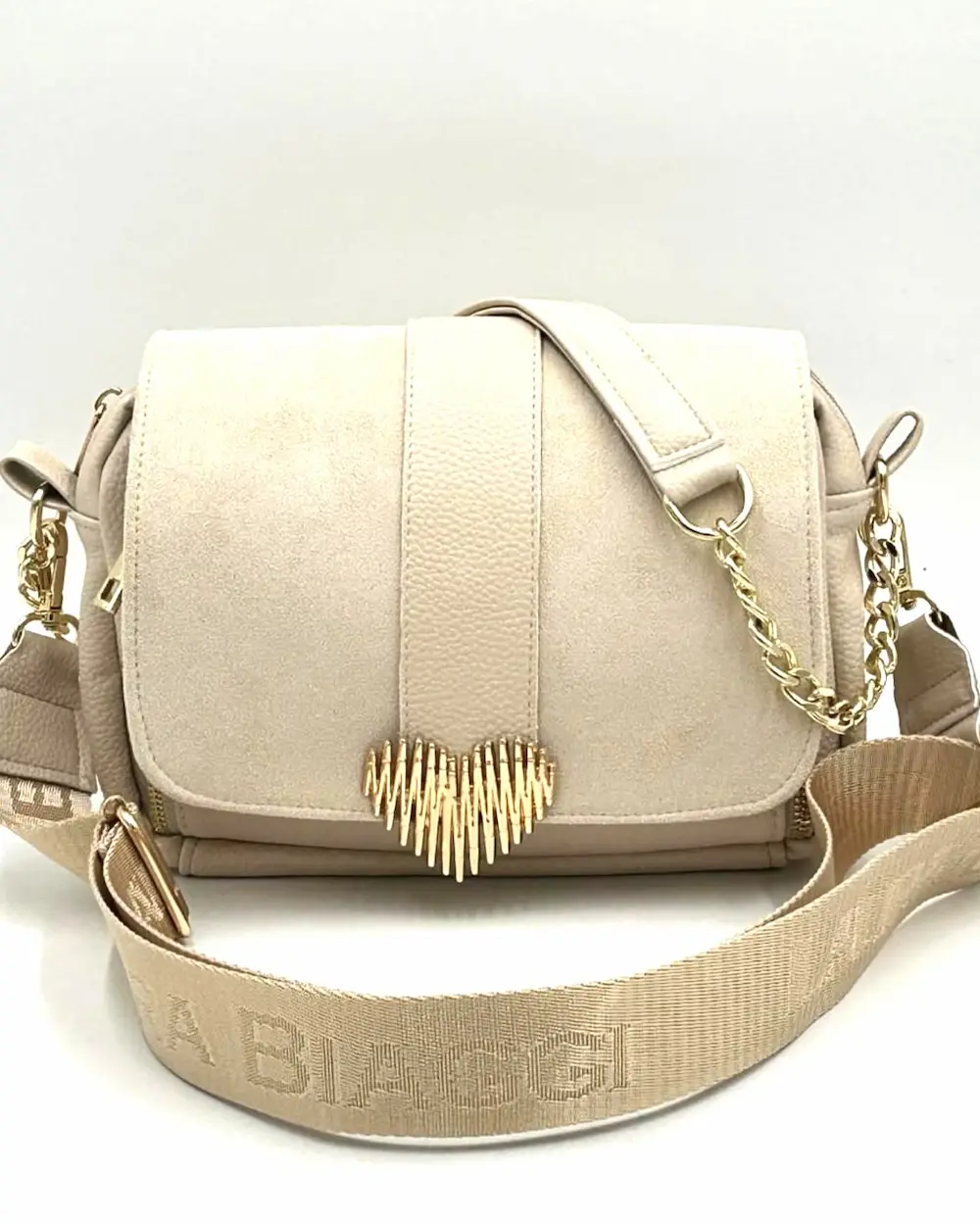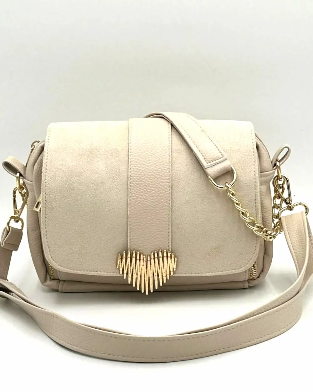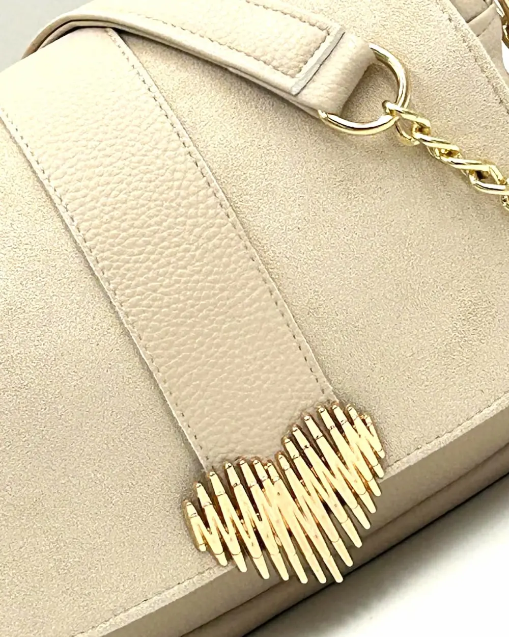 Klapka z jasnobeżowego eko-zamszu ozdobiona została subtelnym, złotym serduszkiem, które dodaje całości kobiecego uroku. Złote okucia pięknie kontrastują z jasnym kolorem torebki, podkreślając jej elegancki charakter.
