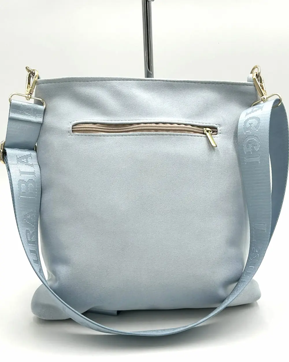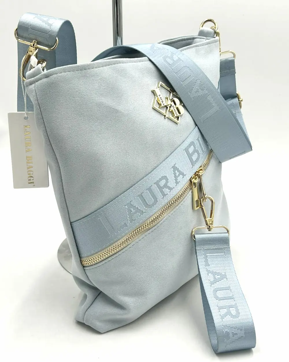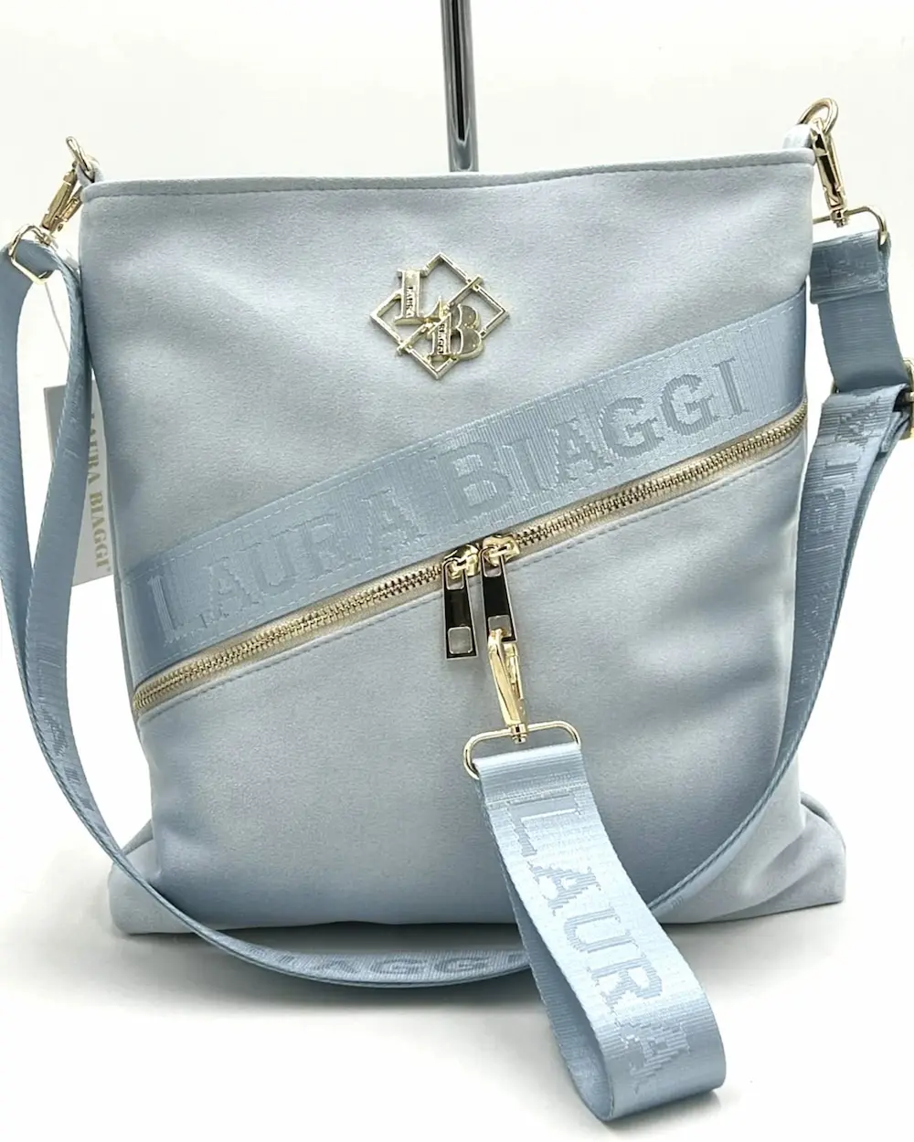 Laura Biaggi damska torebka listonoszka jasnoniebieska zamszowa z logowanym paskiem
