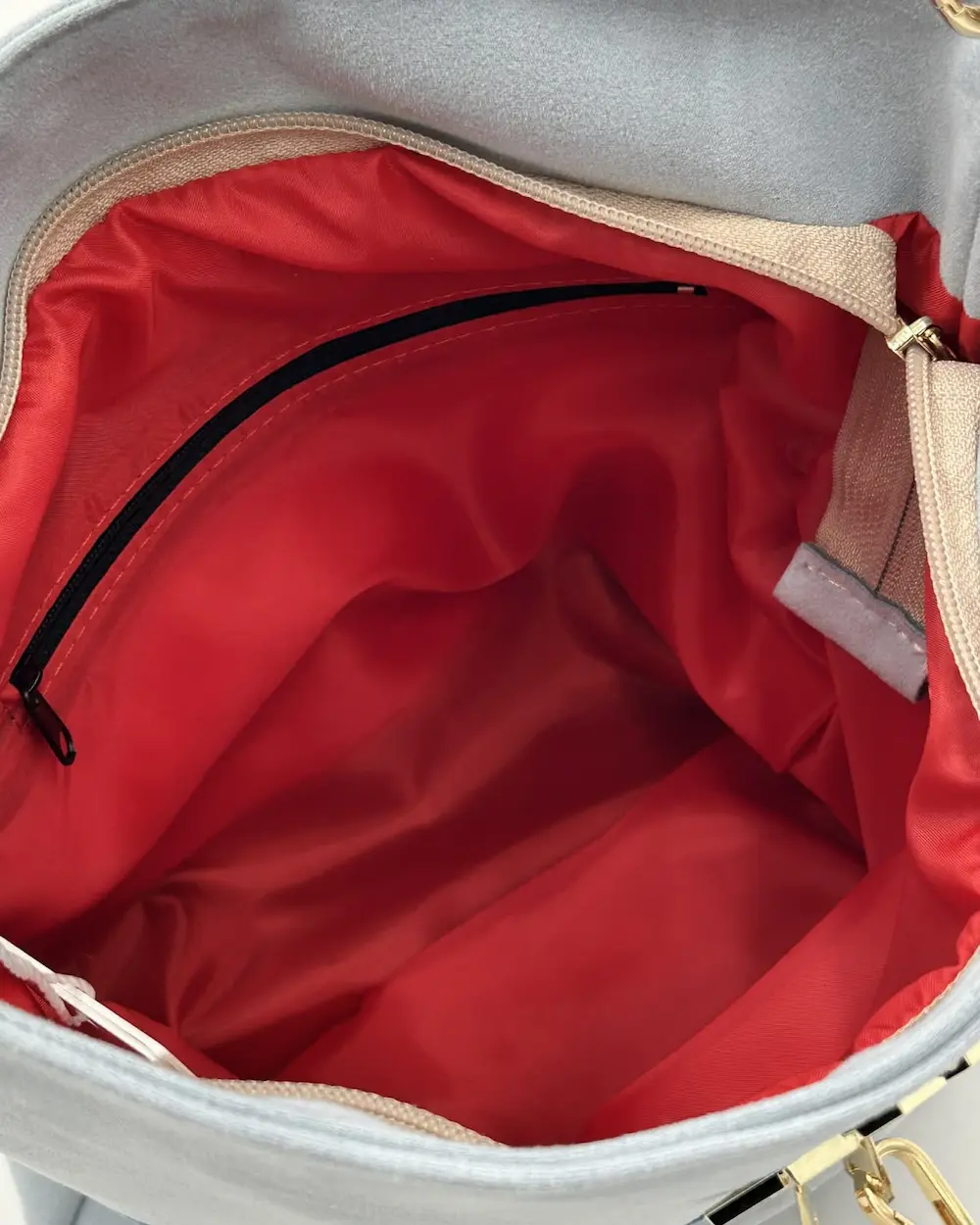Miękki eko-zamsz nadaje jej subtelnej elegancji, a złote okucia i logowane elementy podkreślają modowy charakter modelu.
