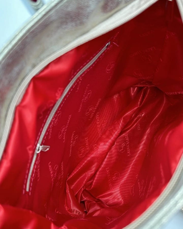 Torebka jest jednokomorowa, a wewnątrz wykończona elegancką czerwoną logowaną podszewką. Znajdziesz tam kieszonkę na suwak, idealną na drobiazgi. Dodatkowo: