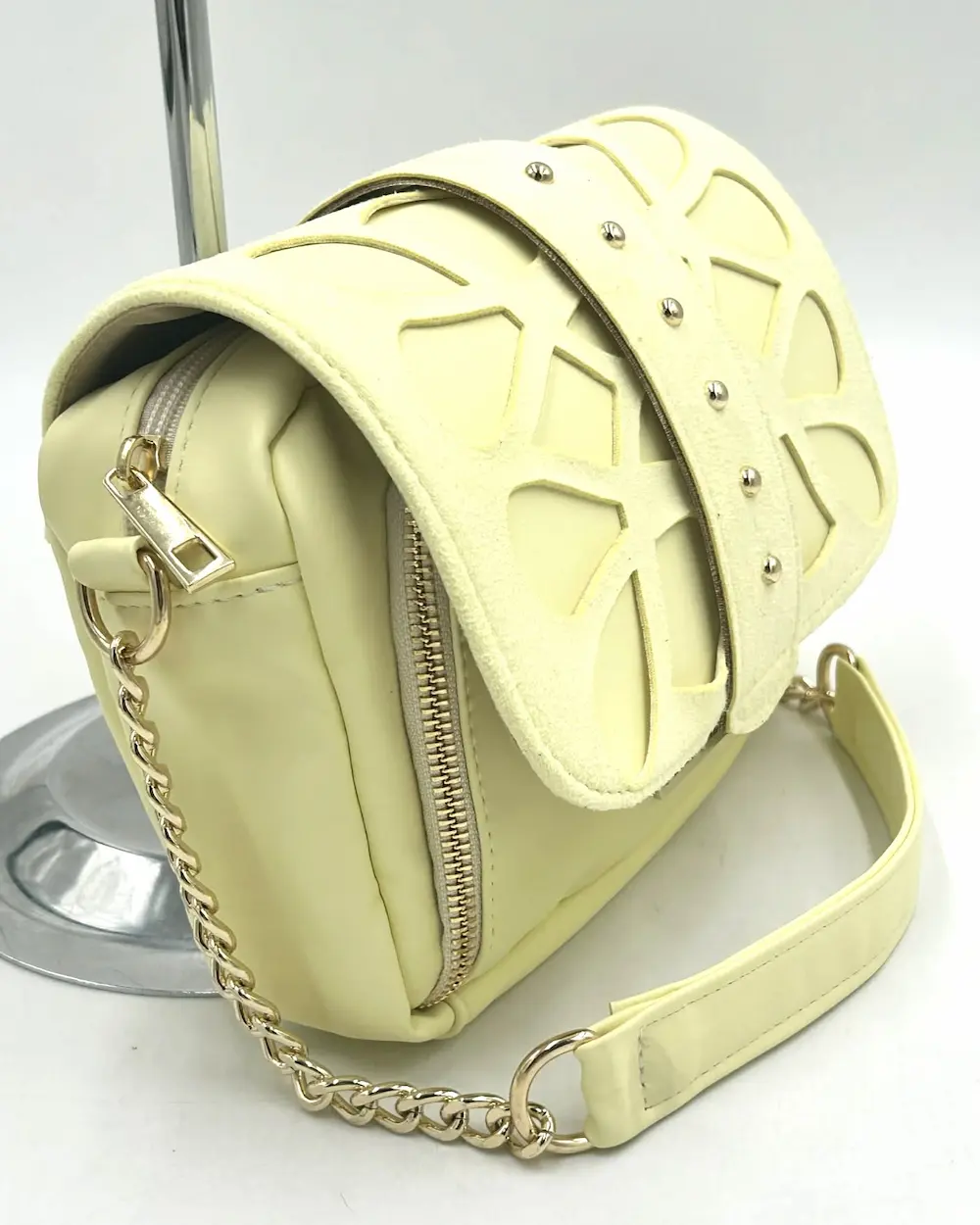 Korpus torebki wykonany jest z ekoskóry, natomiast klapka została ozdobiona ażurowym wzorem z ekologicznego zamszu. Połączenie dwóch struktur sprawia, że model wygląda interesująco i bardziej przestrzennie.
