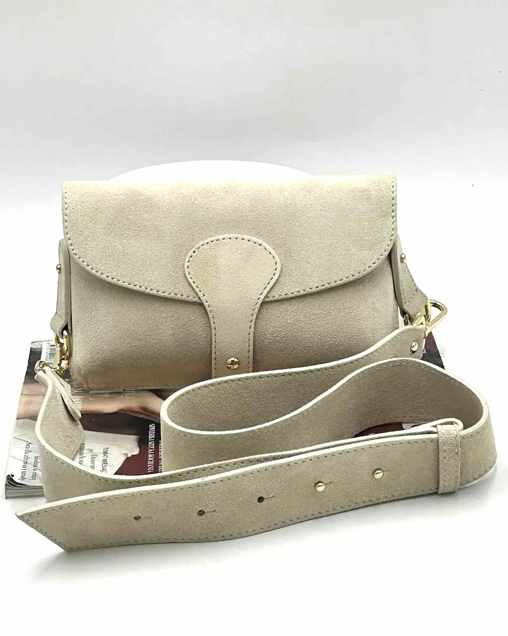 Została wykonana z naturalnego zamszu, który jest przyjemny w dotyku, trwały i nadaje torebce luksusowy charakter. Zamykanie na magnetyczną klapkę zapewnia szybki dostęp do zawartości. Prosty środek bez dodatkowych kieszonek podkreśla minimalistyczny charakter tego modelu.