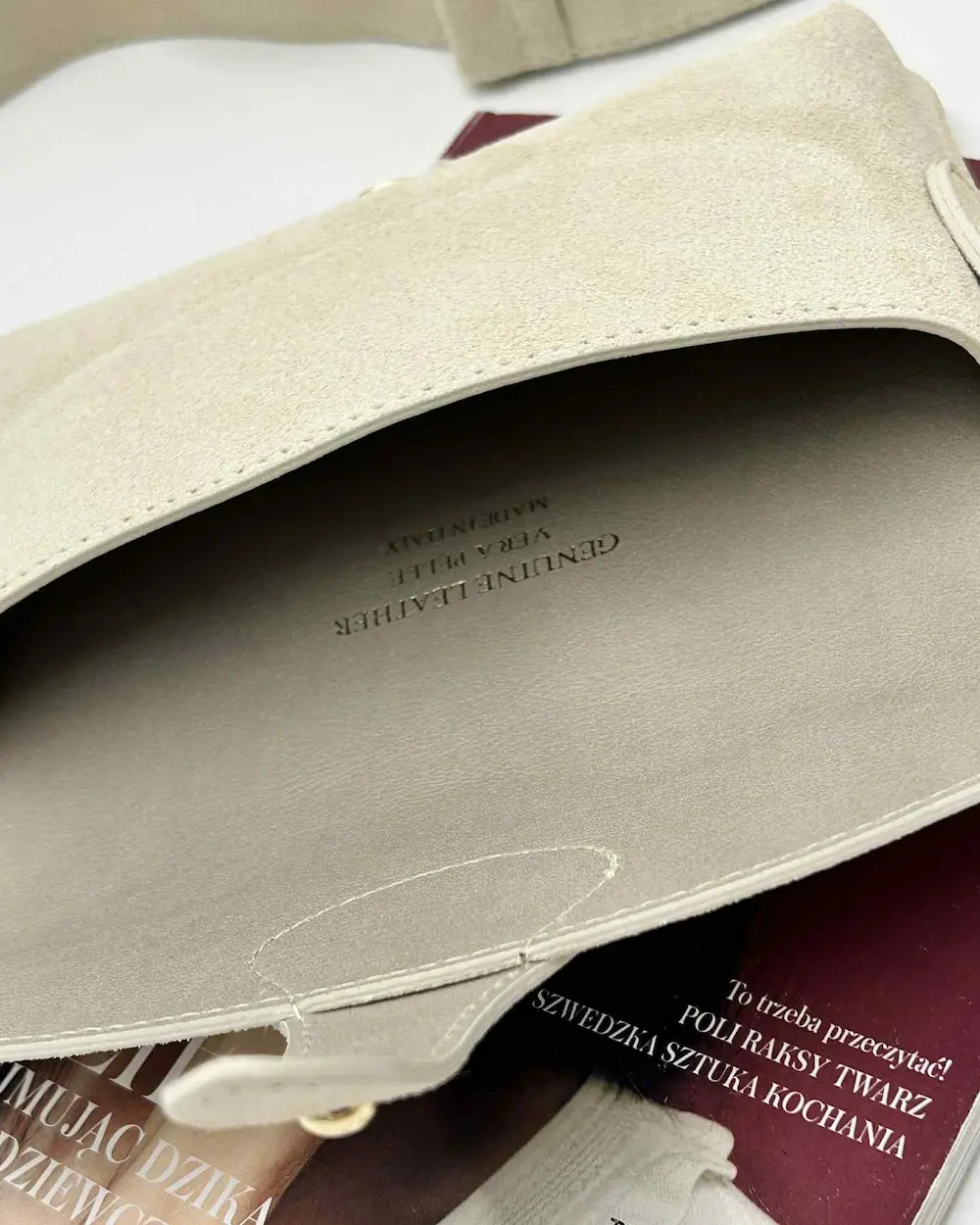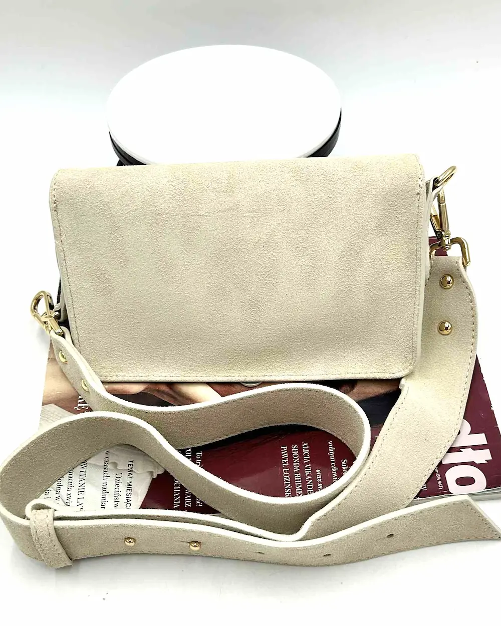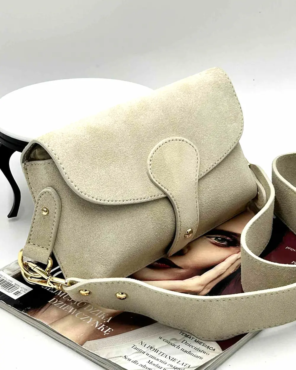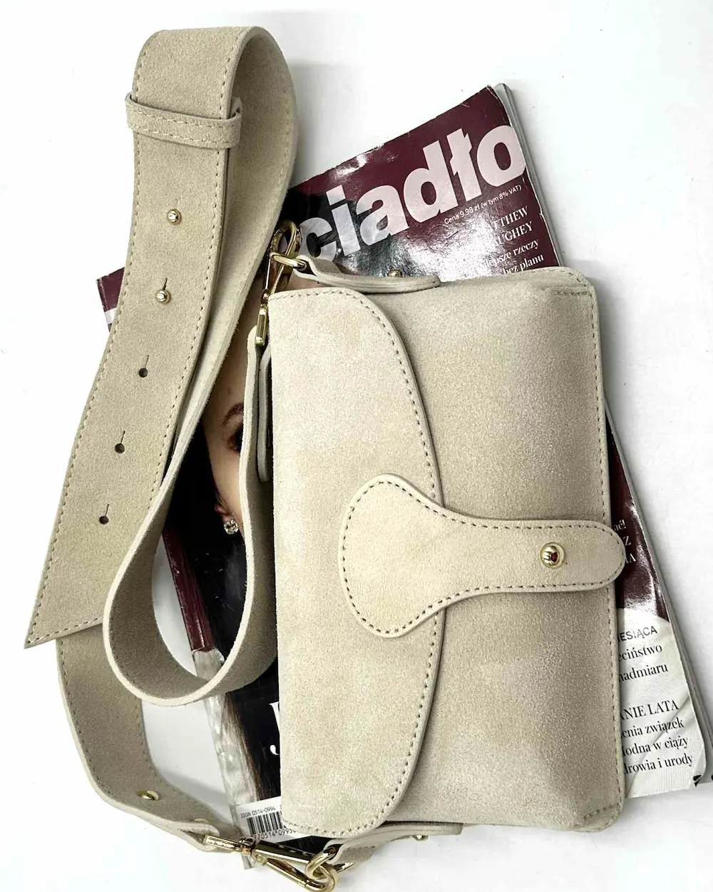 Laura Biaggi damska torebka mini listonoszka jasnobeżowa zamszowa – włoska elegancja w nowoczesnym wydaniu