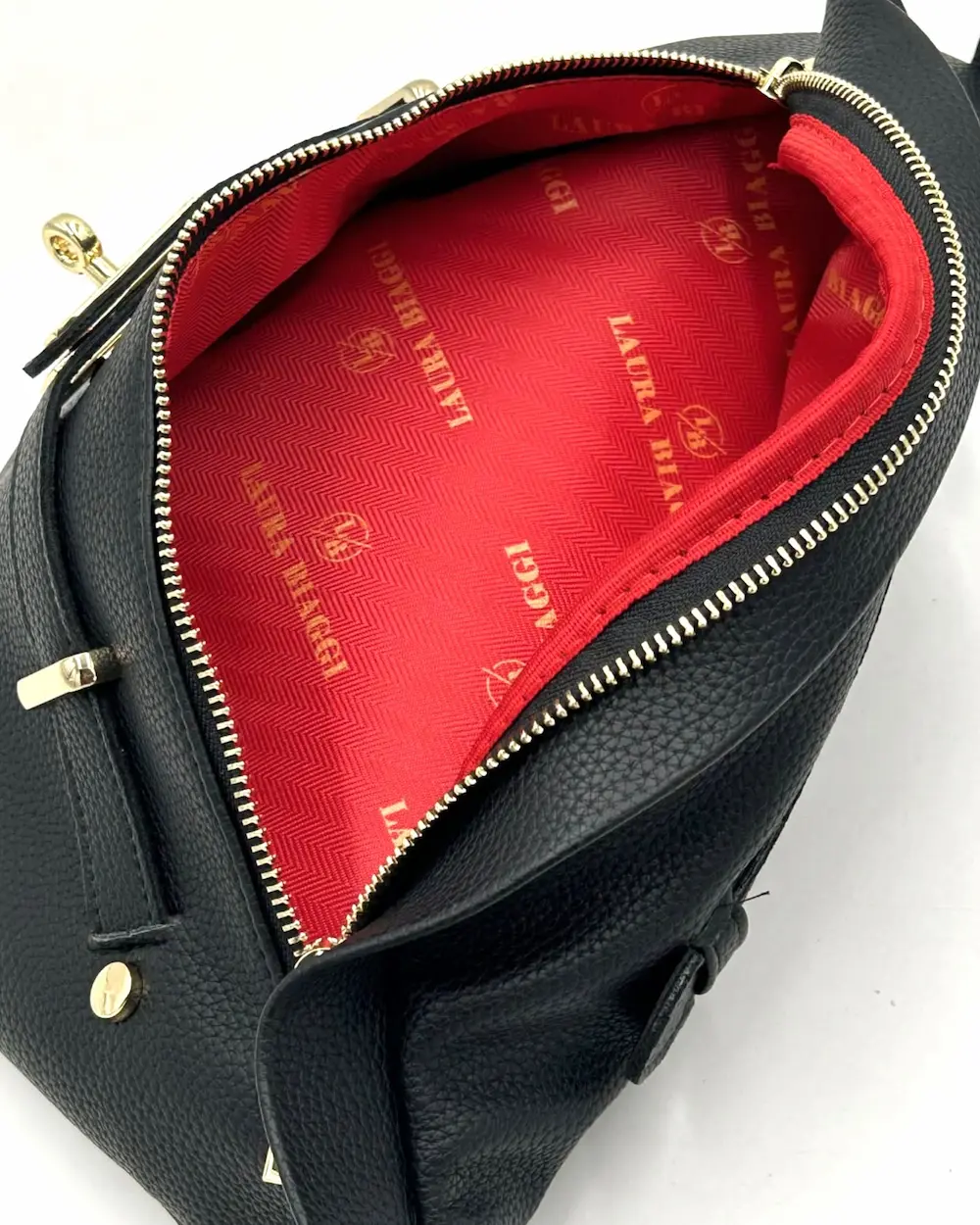 Przód torebki zdobi dekoracyjny pasek z metalowym elementem oraz ozdobny zamek, który podkreśla modowy charakter modelu. Dodatkowym akcentem jest subtelne tłoczenie z nazwą marki Laura Biaggi.