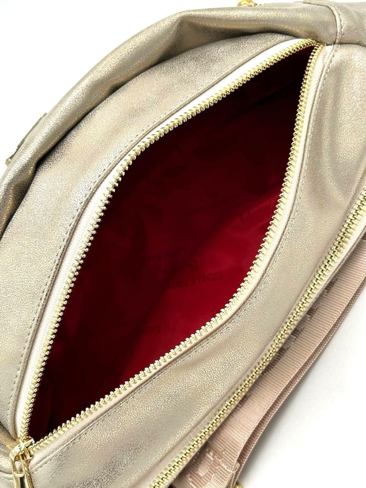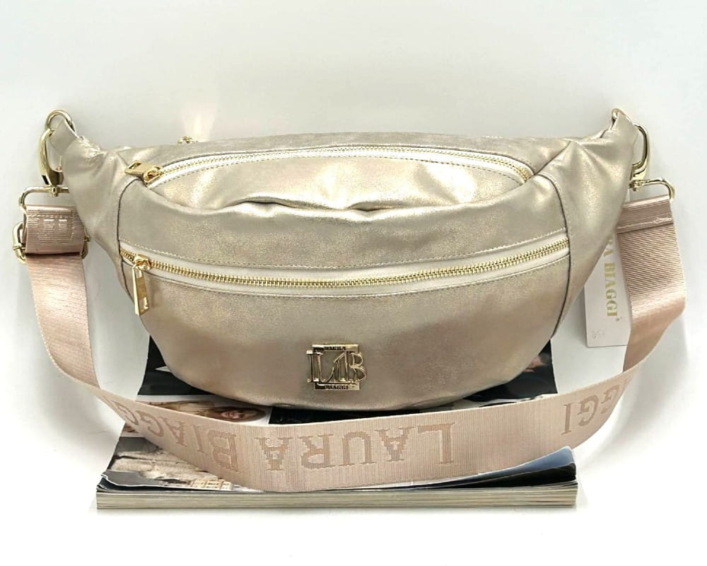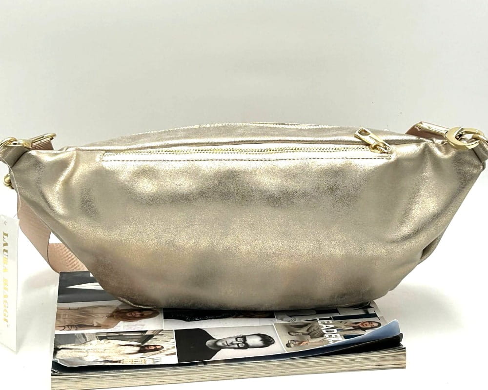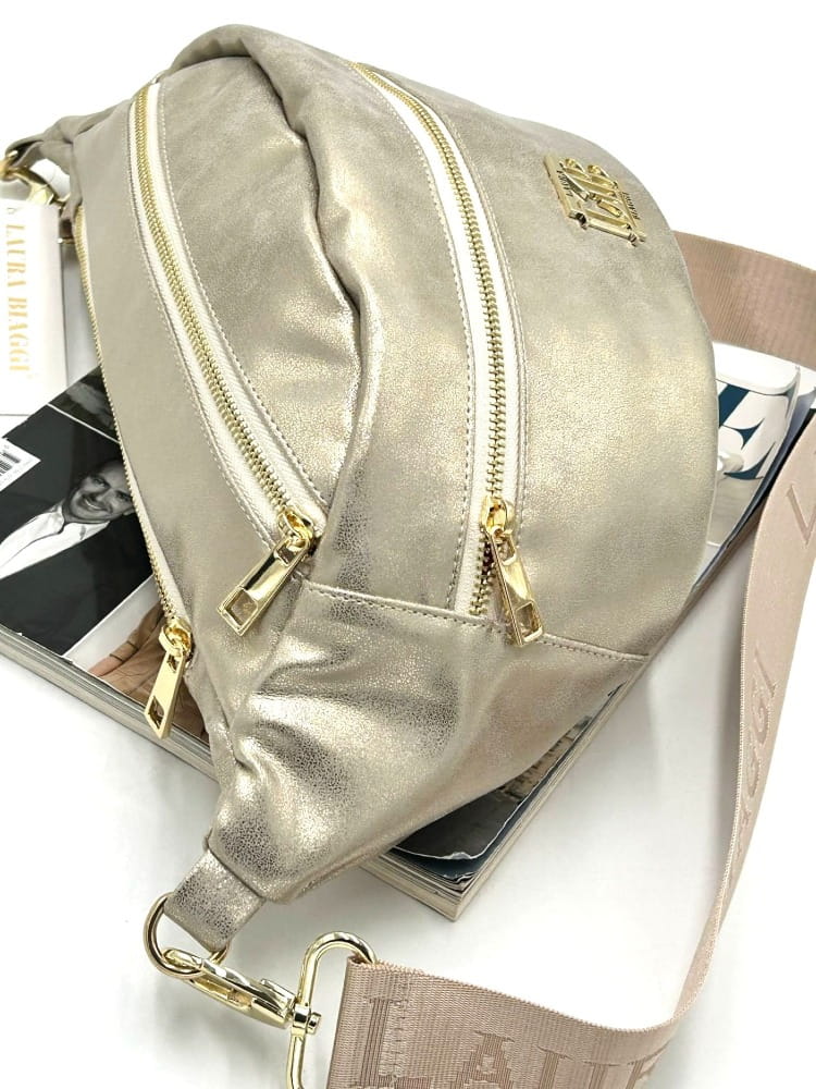 Złota torebka nerka marki Laura Biaggi to połączenie funkcjonalności, modnego designu i elegancji. Wykonana z wysokiej jakości skóry ekologicznej o delikatnym połysku, przyciąga wzrok i świetnie komponuje się zarówno ze sportowymi, jak i codziennymi stylizacjami.