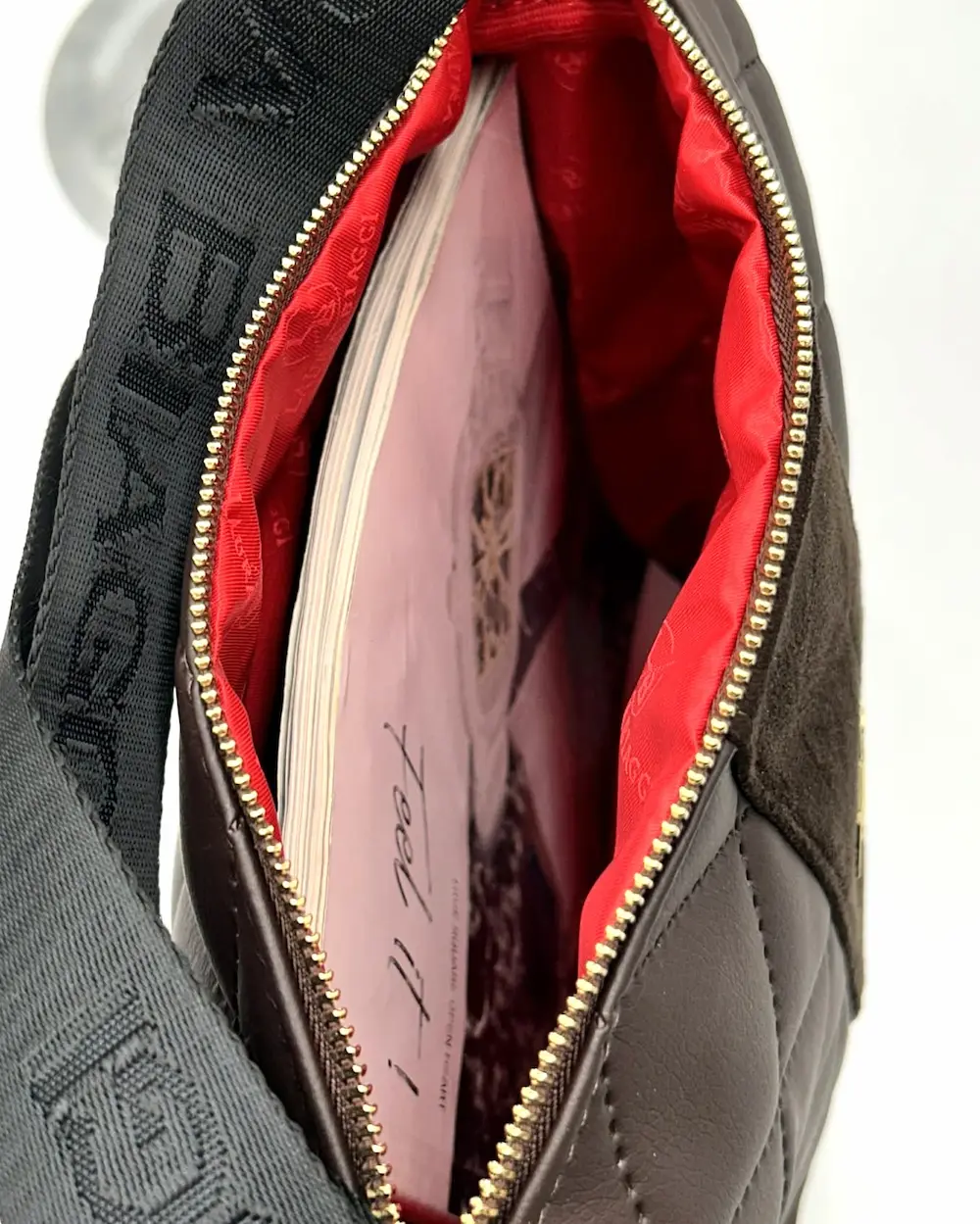 Przód torebki zdobi biżuteryjne logo marki Laura Biaggi oraz dwie praktyczne kieszonki z ozdobnymi chwostami, które dodają całości wyjątkowego uroku.