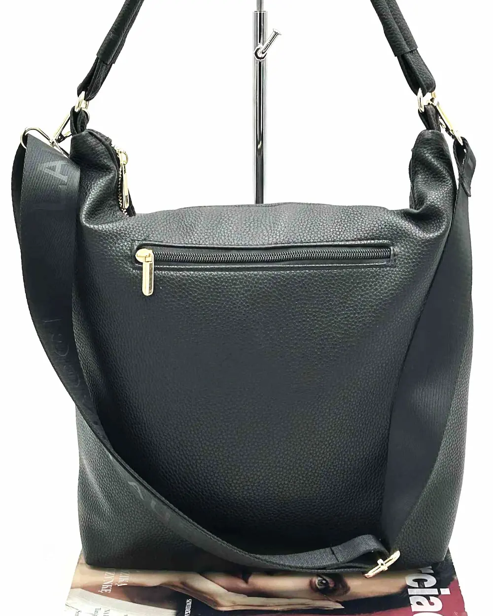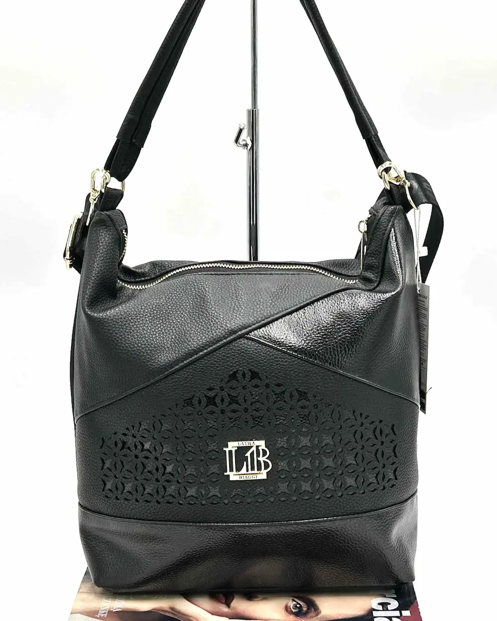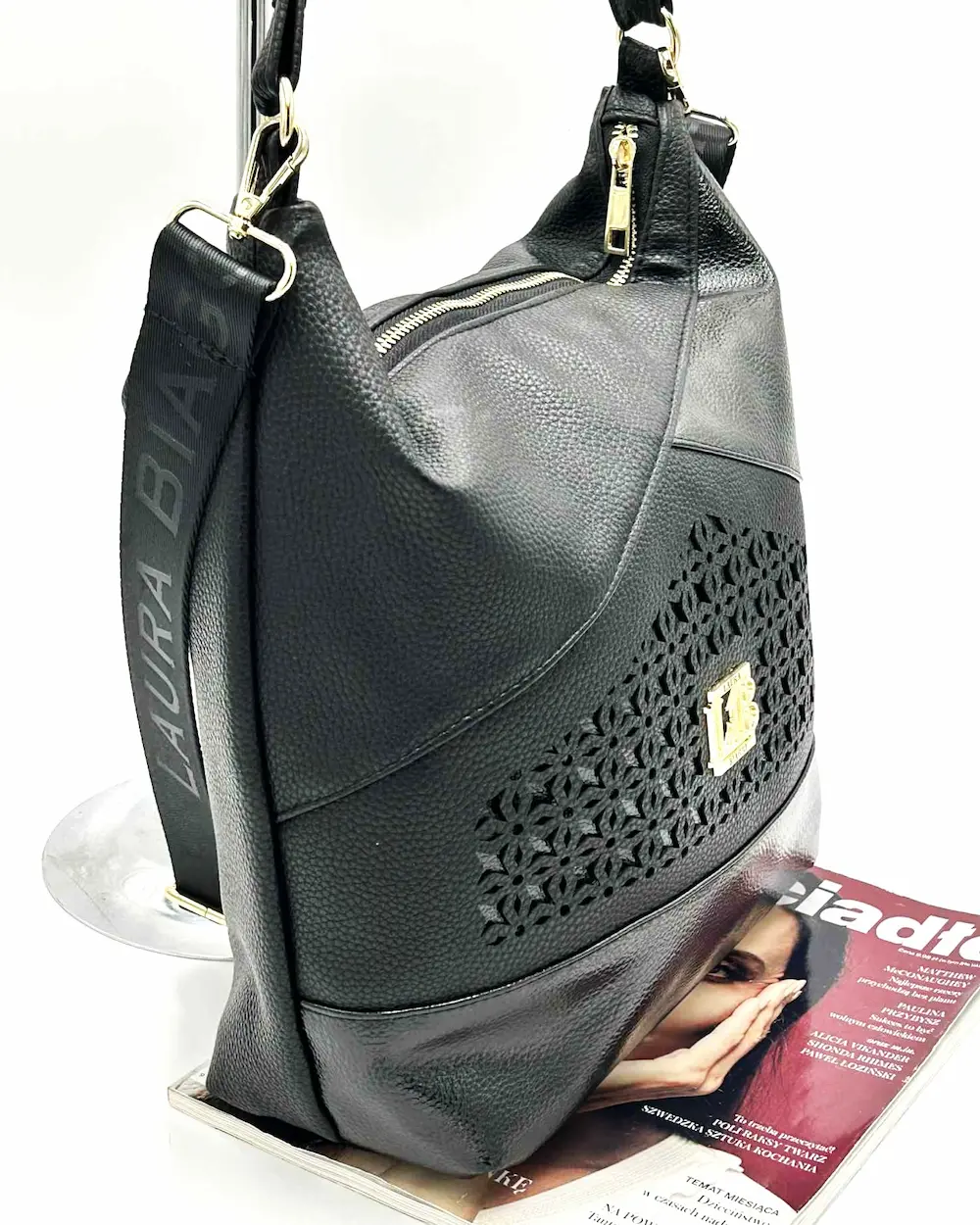 Damska shopperka marki Laura Biaggi, renomowanego polskiego producenta, to propozycja łącząca nowoczesny design z funkcjonalnością. Torebka została wykonana z wysokiej jakości skóry ekologicznej w matowym, czarnym wykończeniu. Na froncie zdobi ją ażurowa wstawka z biżuteryjnym logo, a całość uzupełniają subtelne czarne elementy z delikatnym połyskiem, które nadają jej wyjątkowego charakteru.