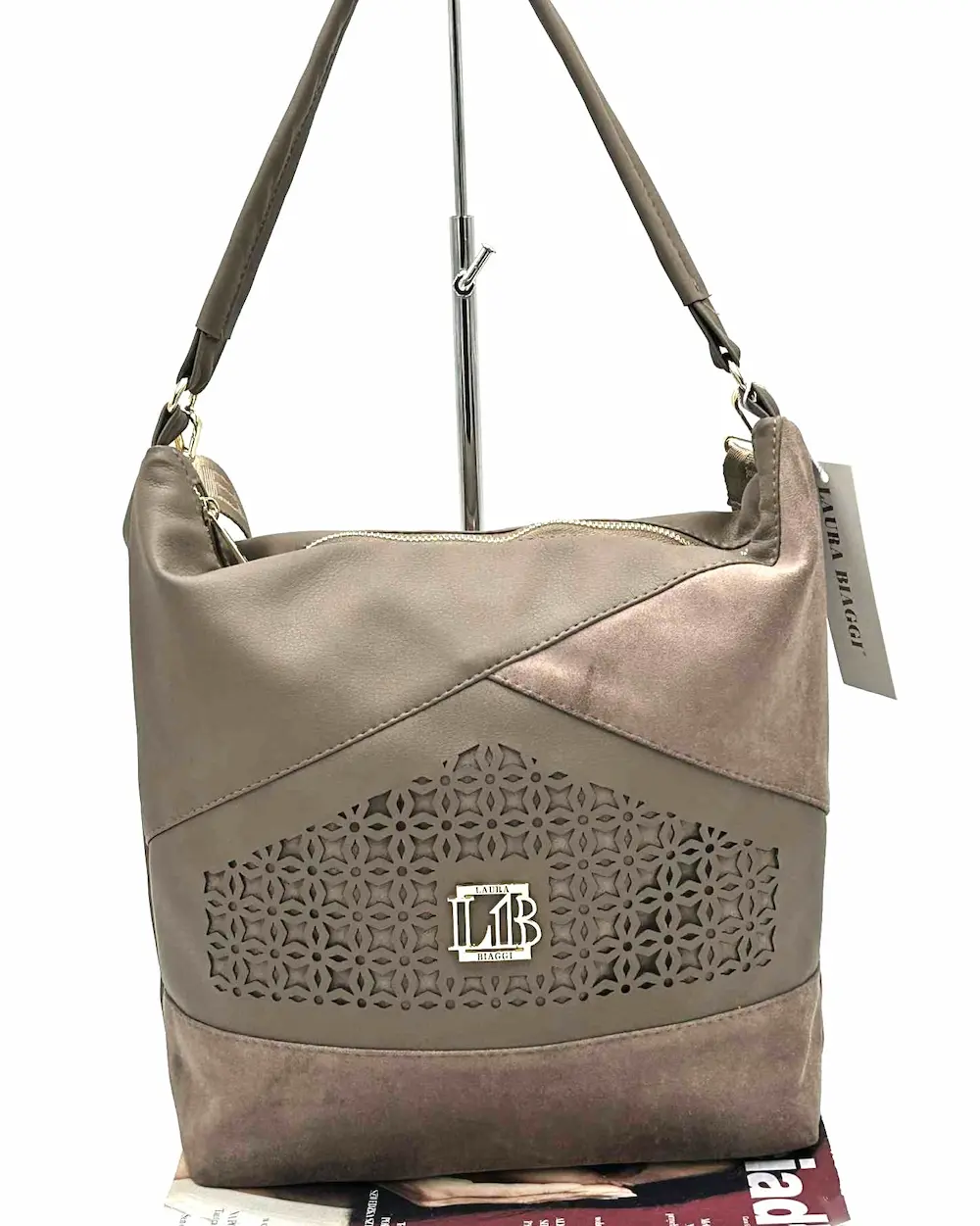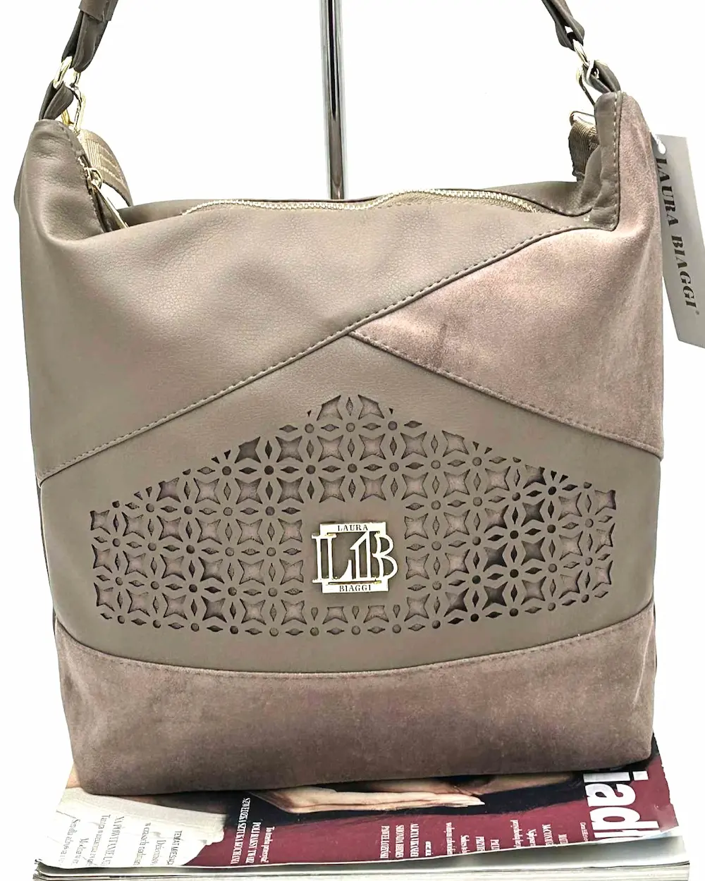 Laura Biaggi – torebka shopperka taupe z ażurową i zamszową wstawką
