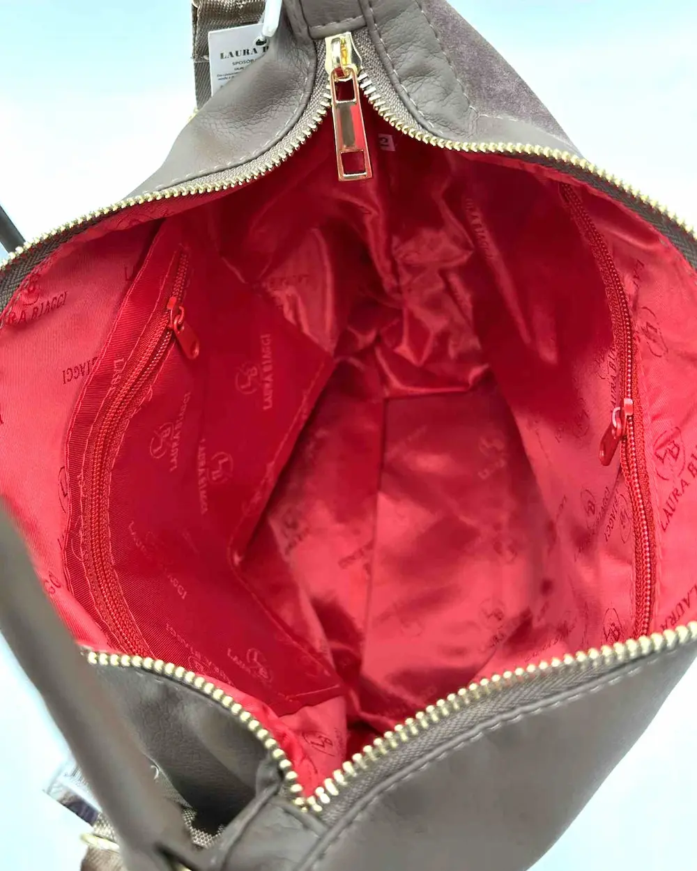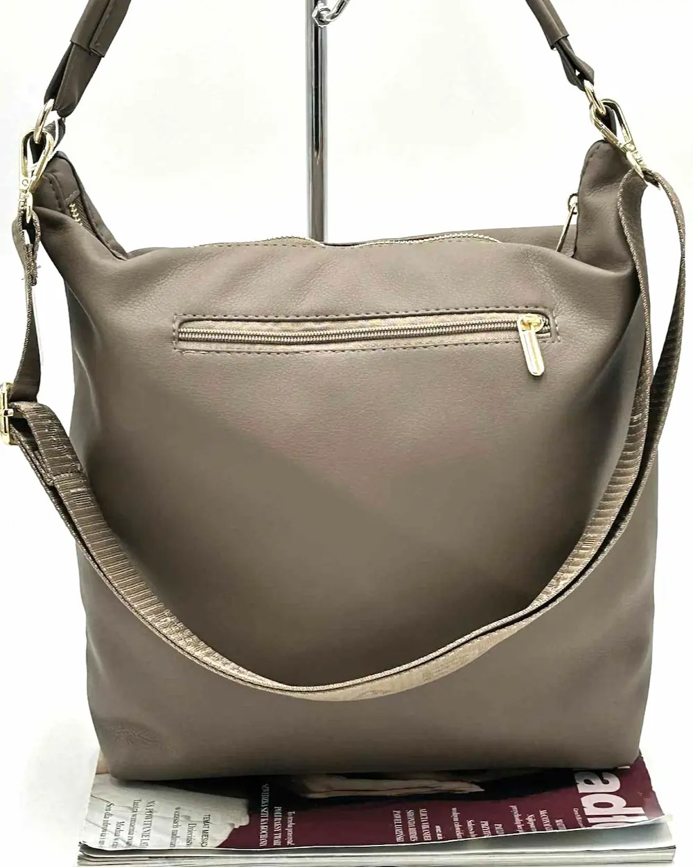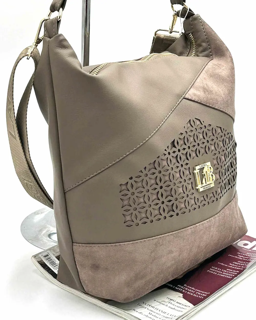 Torebka damska shopper od polskiej marki Laura Biaggi to styl i funkcjonalność w jednym. Model w eleganckim odcieniu taupe został wzbogacony o ażurową wstawkę z dekoracyjnym logo marki oraz miękki element z delikatnego zamszu, co nadaje jej modnego charakteru i wyjątkowej lekkości. Torebka średniej wielkości - mieści format B5 i wiele więcej, shopperka jest pakowna.