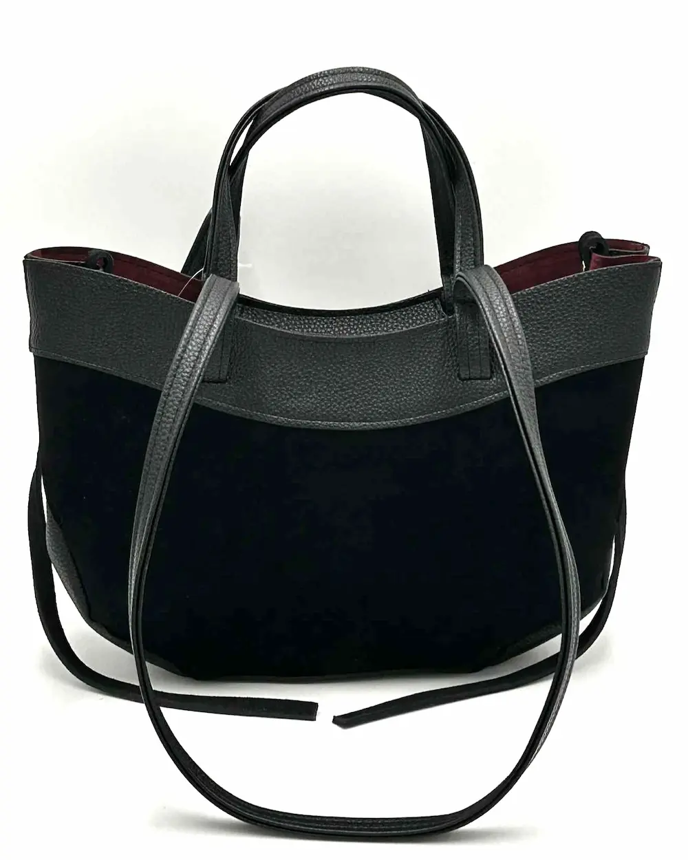 Wyjątkowa damska mini shopperka marki Laura Biaggi zachwyca eleganckim połączeniem zamszowej skóry ekologicznej z gładką eko-skórą o delikatnej fakturze.