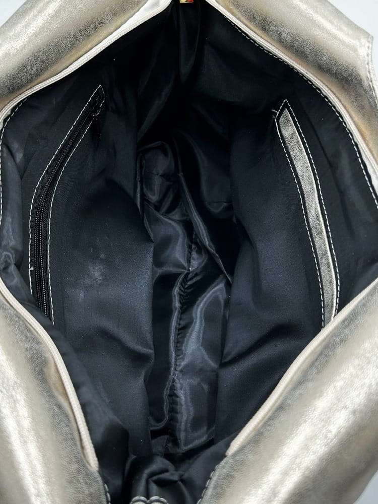 W środku znajdziesz czarną podszewkę oraz praktyczny układ kieszonek: jedną zapinaną na zamek i dwie otwarte – idealne na telefon czy klucze. Na tyle torby znajduje się dodatkowa kieszeń na suwak.
