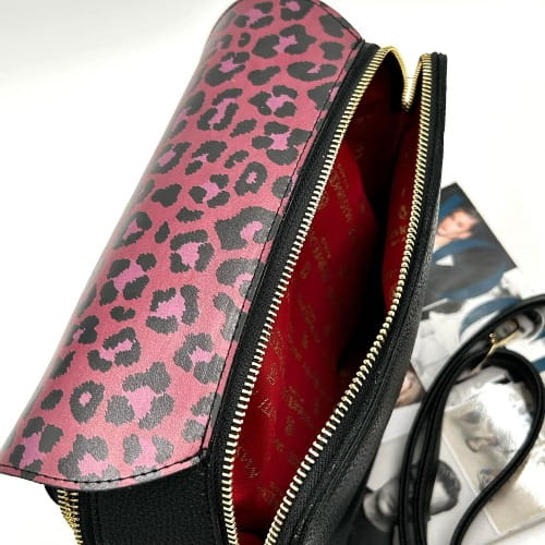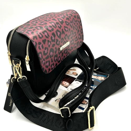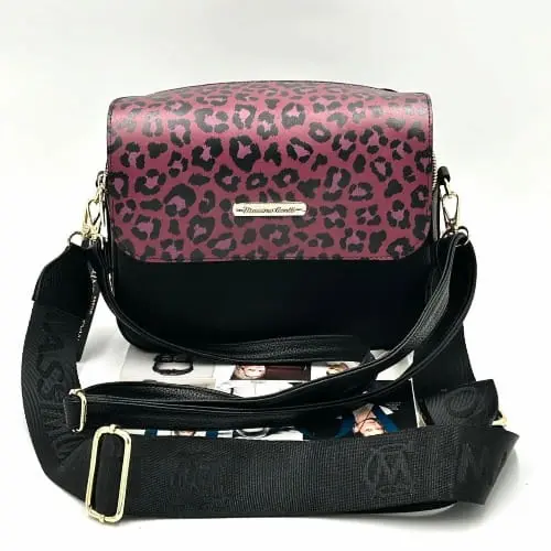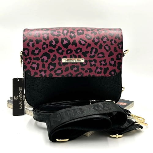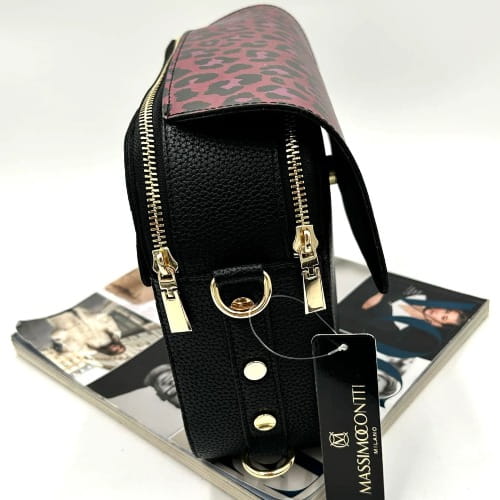 Massimo Contti – czarna listonoszka damska dwukomorowa z klapką w panterkę różowo-czarna