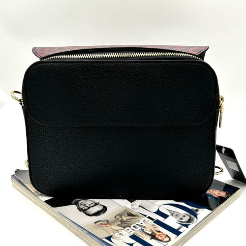 Czarna torebka listonoszka Massimo Contti to nowoczesne połączenie klasyki i wyrazistego stylu. Jej klapka ozdobiona została efektownym printem w różowo-czarną panterkę, który nadaje całości wyjątkowego charakteru. To idealny wybór dla kobiet ceniących modowe detale.