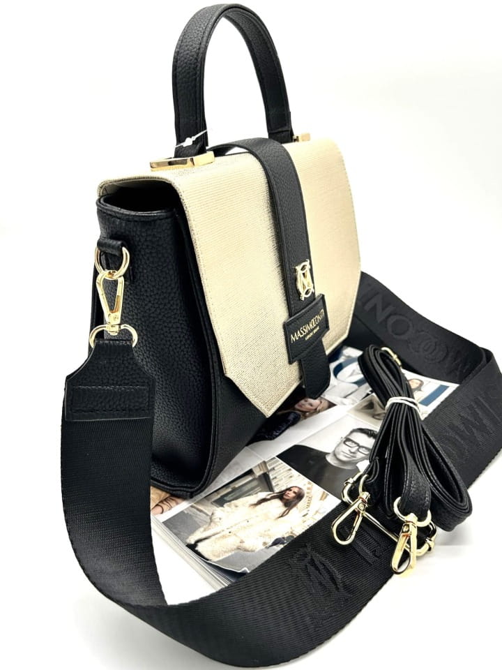 Stylowa torebka damska Massimo Contti w formie eleganckiego kuferka, wykonana z wysokiej jakości skóry ekologicznej w klasycznym czarnym kolorze. Największym wyróżnikiem modelu jest efektowna klapka w kolorze złota, która nadaje torebce luksusowego i niepowtarzalnego charakteru.