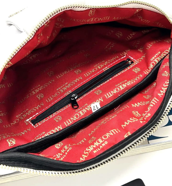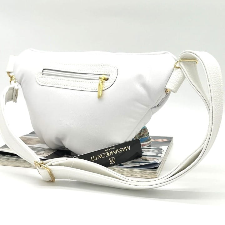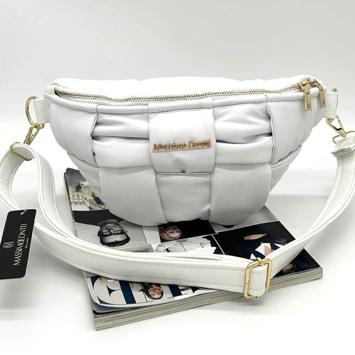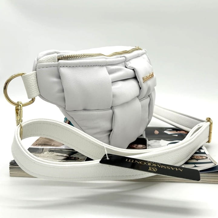 Szukasz dodatku, który podkreśli Twój styl i będzie jednocześnie praktyczny? Torebka nerka Massimo Contti w kolorze białym łączy nowoczesny design z eleganckim wykończeniem. Pleciony przód oraz biżuteryjne logo marki sprawiają, że model ten przyciąga spojrzenia.