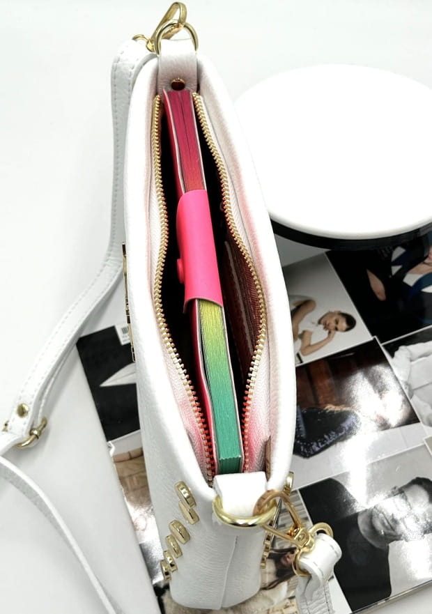 Złote detale i biel skóry tworzą ponadczasową, elegancką całość.