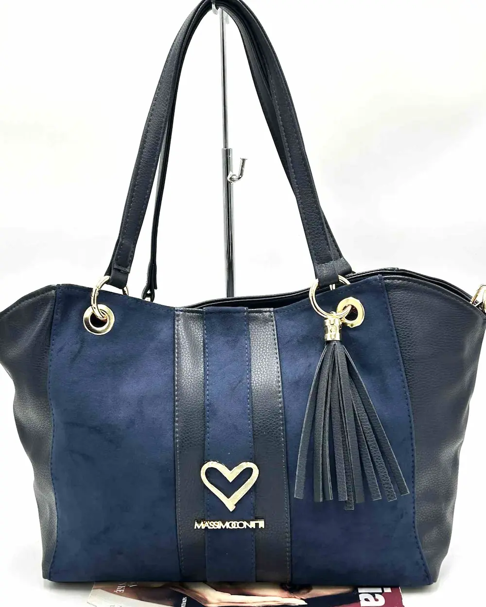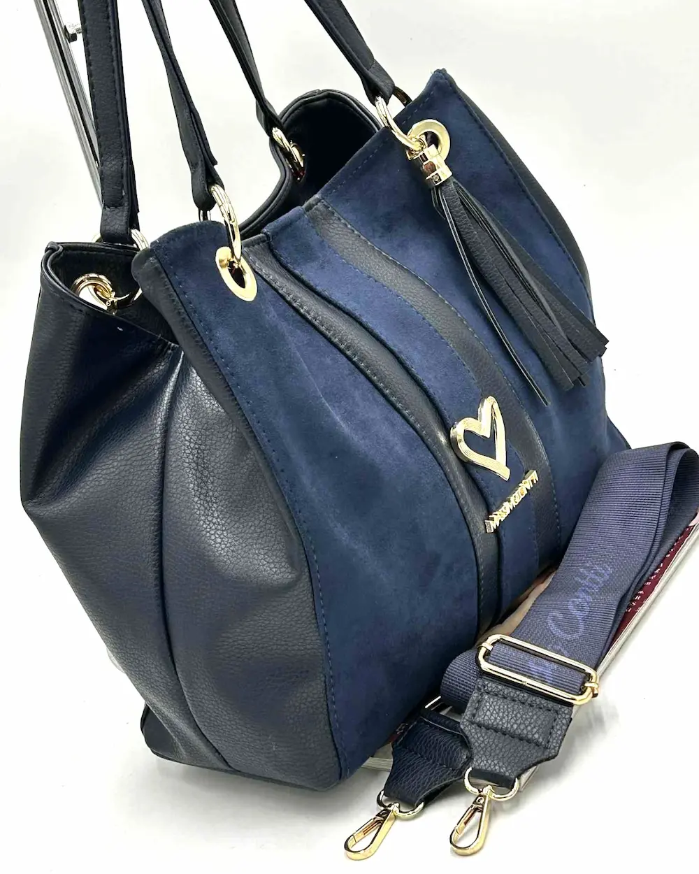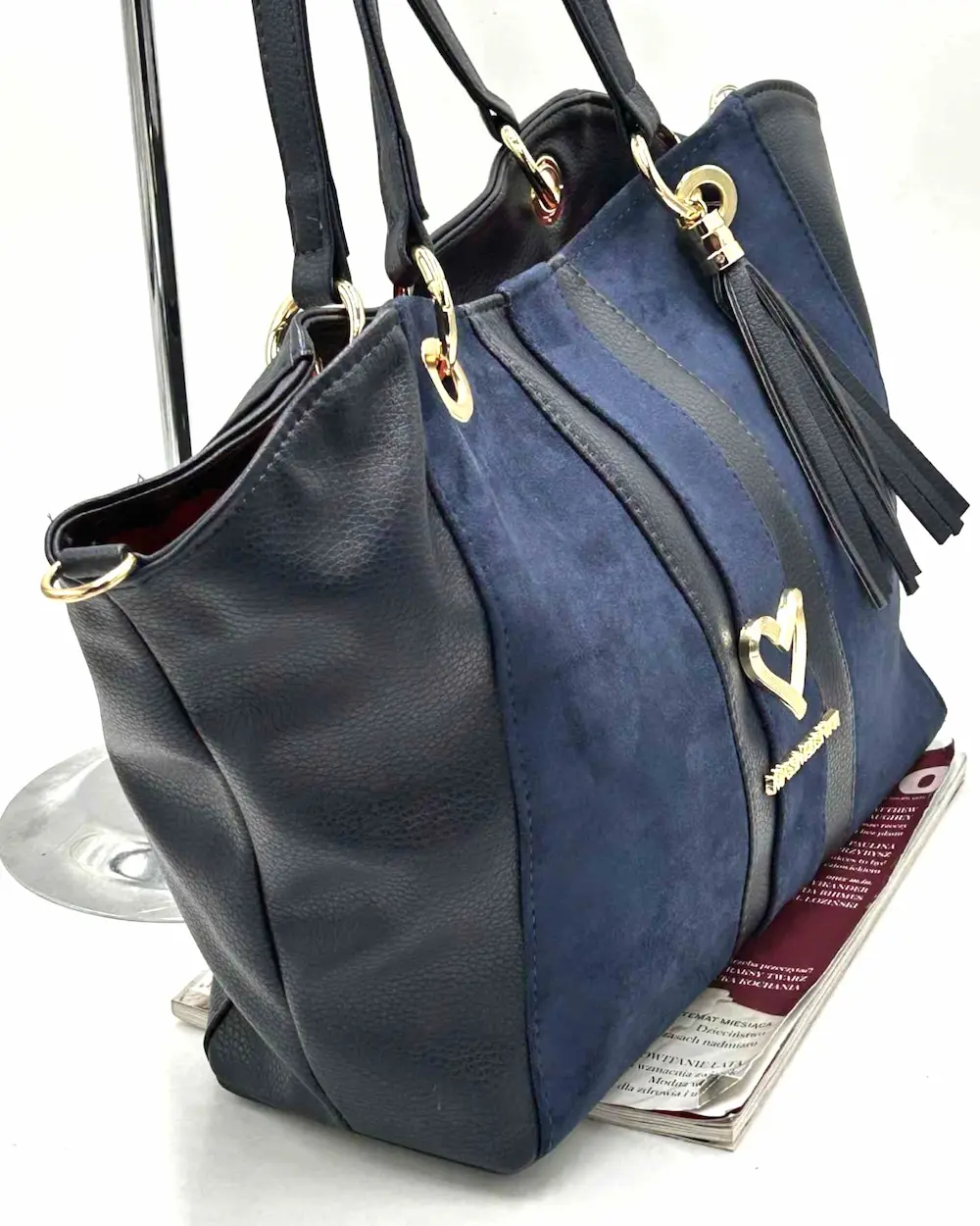 Massimo Contti – granatowa shopperka z biżuteryjnym logo, złotym serduszkiem i ozdobnym chwostem