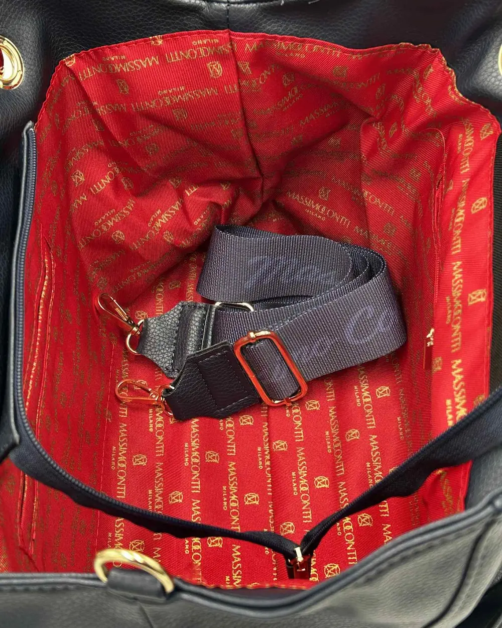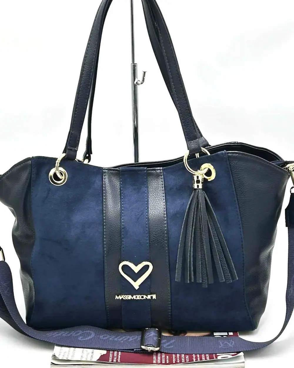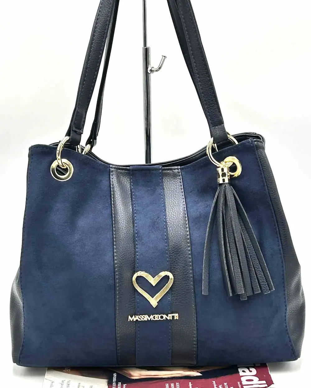 Massimo Contti – granatowa shopperka z biżuteryjnym logo, złotym serduszkiem i ozdobnym chwostem