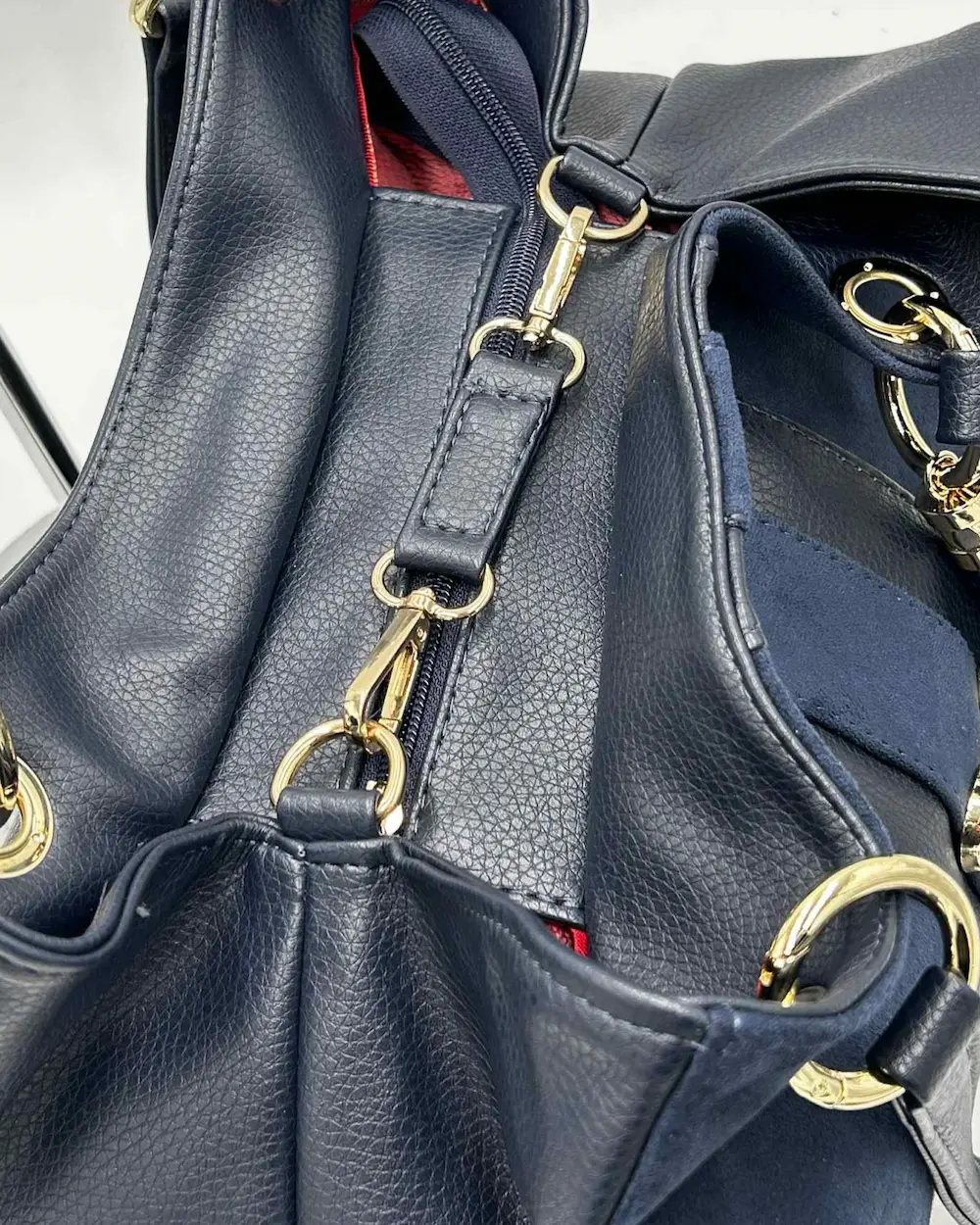 Wnętrze: elegancka czerwona logowana podszewka, kieszonka na suwak, kieszonka otwarta oraz karabińczyk do spięcia boków (możliwość zmiany fasonu na smuklejszy)