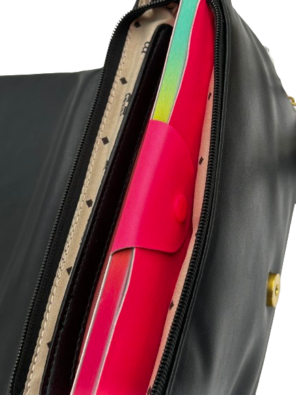 Pasek łączy w sobie ekoskórę i elegancki łańcuszek, co umożliwia noszenie torebki zarówno na ramieniu, jak i w stylu crossbody. Choć nie mieści formatu A5, zbliżone wymiary sprawiają, że jest bardzo poręczna.