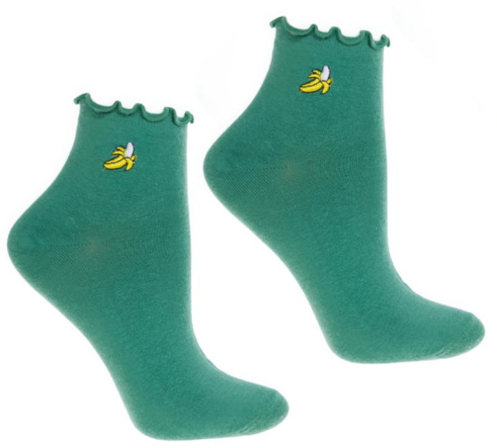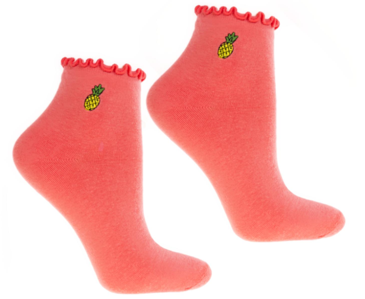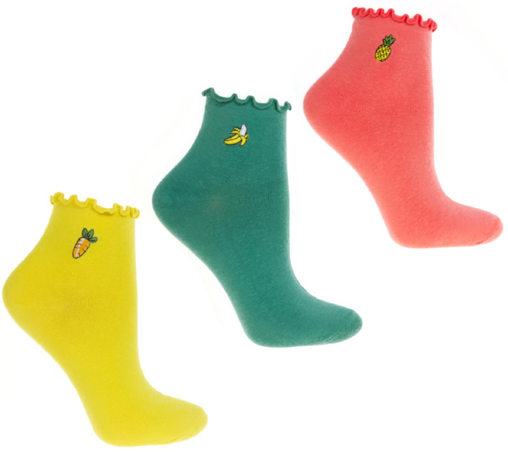Każda para ozdobiona została subtelnym haftem przedstawiającym owoce lub warzywa, co sprawia, że są nie tylko stylowe, ale też wywołują uśmiech. Ściągacz zakończony delikatną falbanką trzyma skarpetkę na miejscu, nie uciskając kostki. Materiał jest miękki, przewiewny i świetnie dopasowuje się do stopy, dzięki czemu sprawdzi się przez cały dzień – w pracy, domu czy na spacerze.