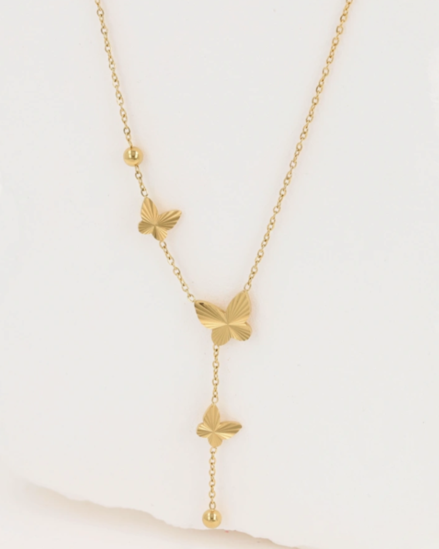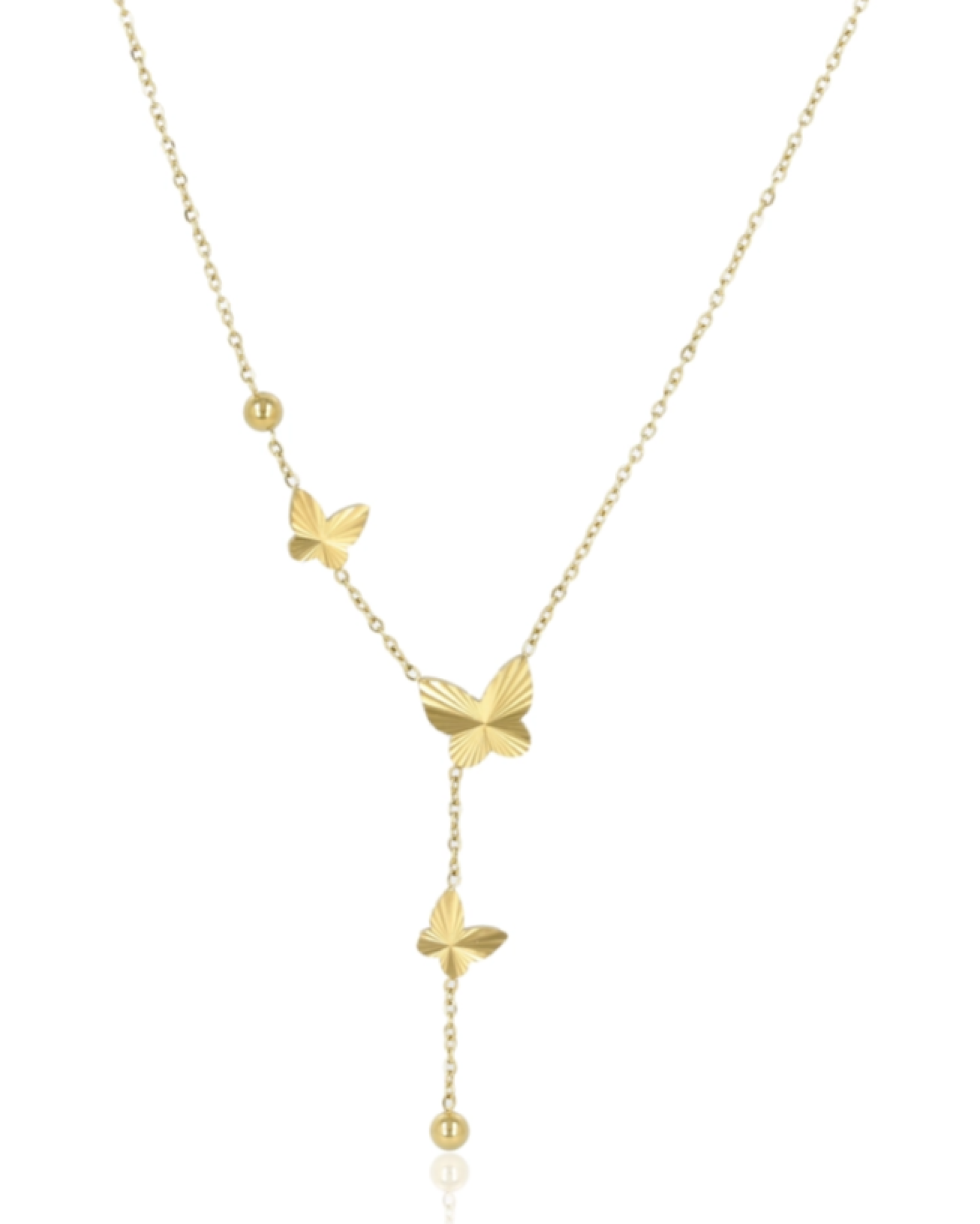 Naszyjnik damski z krawatką i motylkami – złoty, stal szlachetna