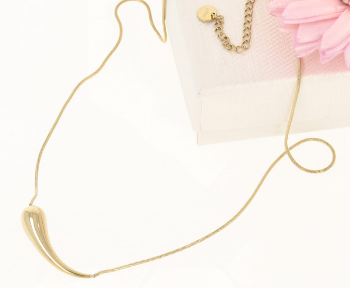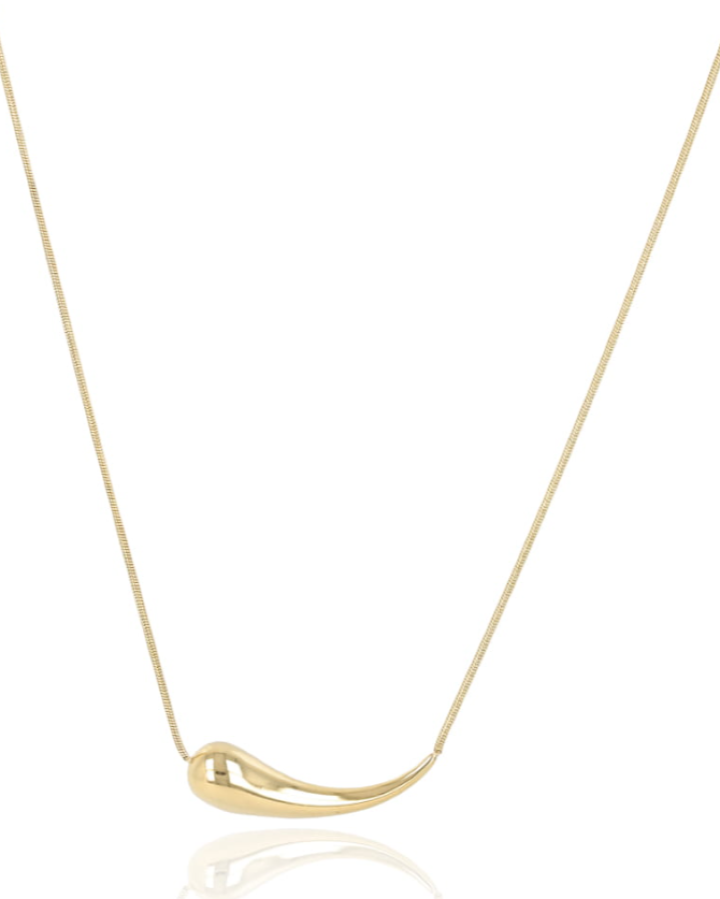 Delikatny złoty naszyjnik z przeciągniętą, dmuchaną zawieszką w formie kropli to doskonały dodatek dla każdej kobiety, która ceni minimalizm i ponadczasowy styl. Zawieszka dodaje lekkości i elegancji, tworząc idealną kompozycję na co dzień, ale także do stylizacji na specjalne okazje.