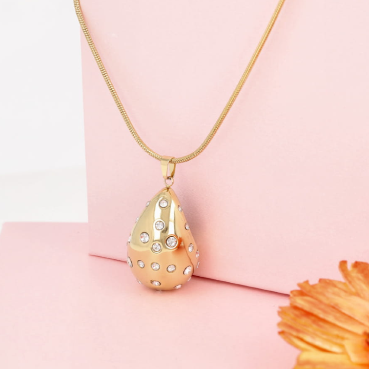 Delikatny i stylowy naszyjnik złoty ze stali chirurgicznej to klasyczny dodatek do kobiecej garderoby. Zawieszka w kształcie dmuchanej kropli (3 cm × 1,5 cm), ozdobiona lśniącymi cyrkoniami, przyciąga uwagę subtelnym blaskiem.