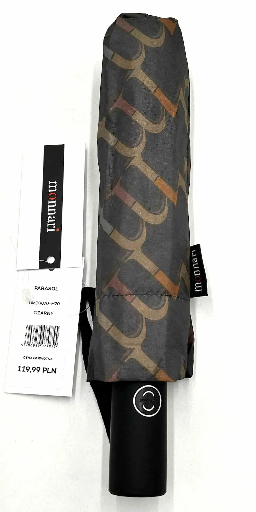 Ta wyjątkowa parasolka Monnari to idealne połączenie stylu i praktyczności. Ciemna kolorystyka z subtelnym motywem liter „m” tworzy elegancki, rozpoznawalny wzór charakterystyczny dla marki.