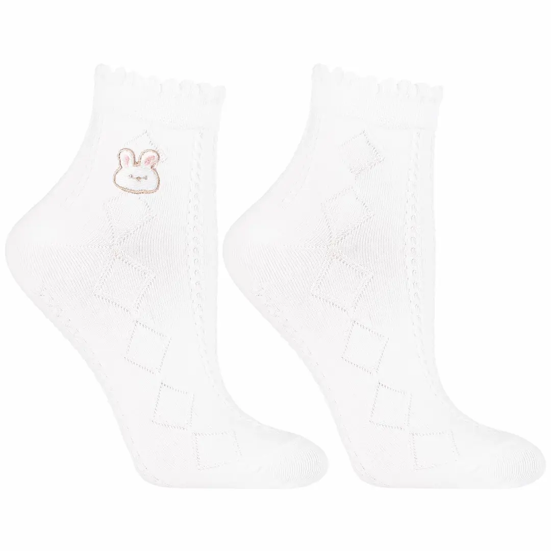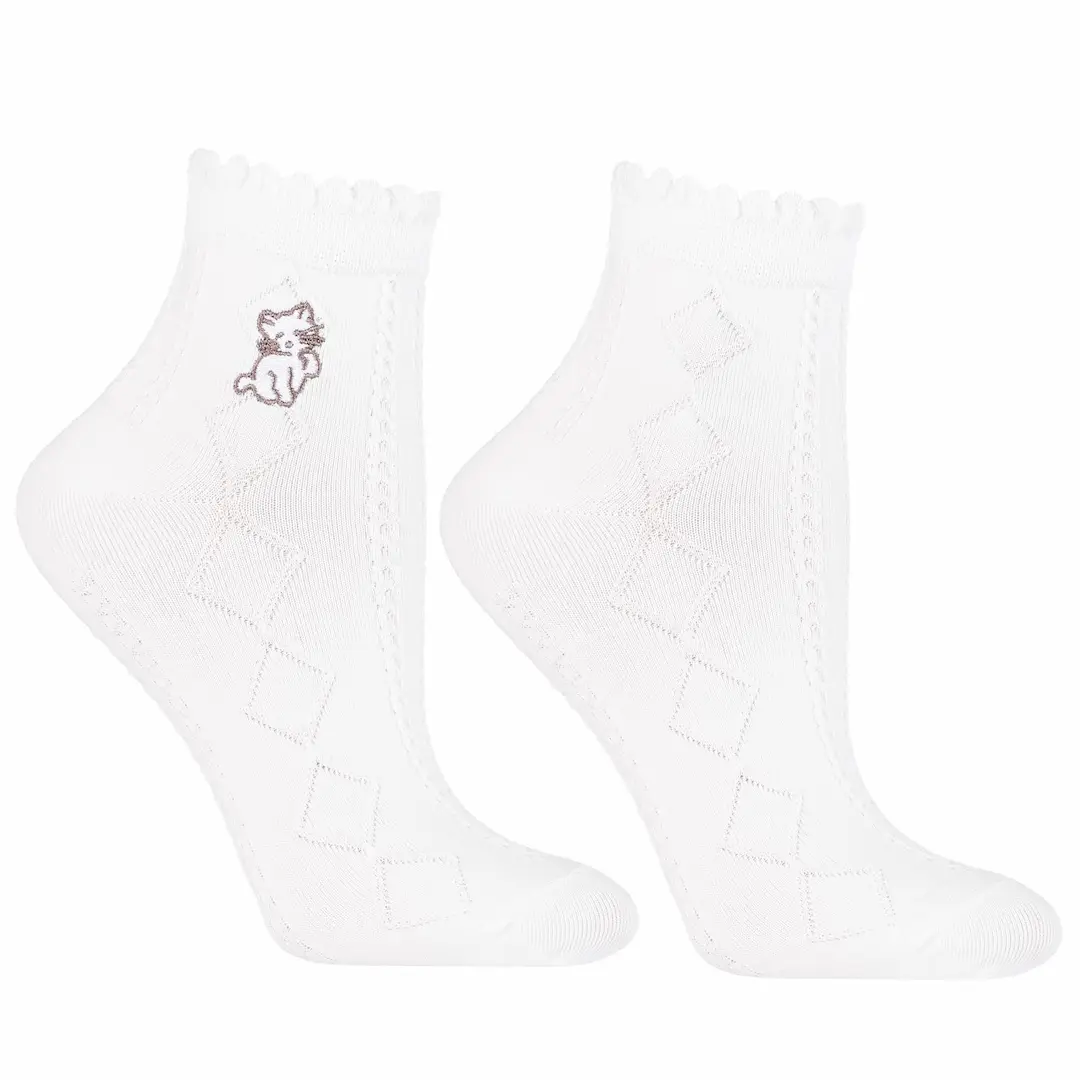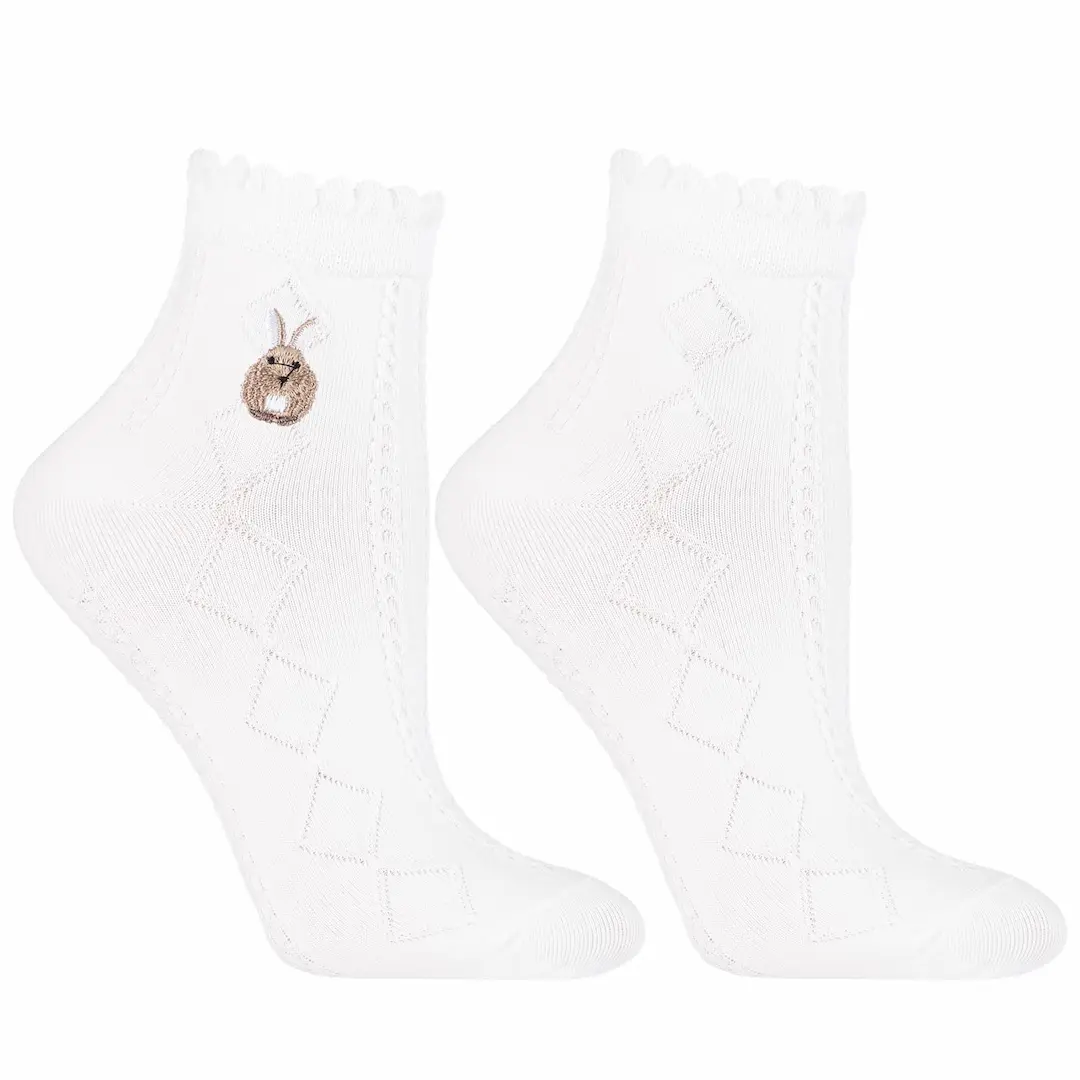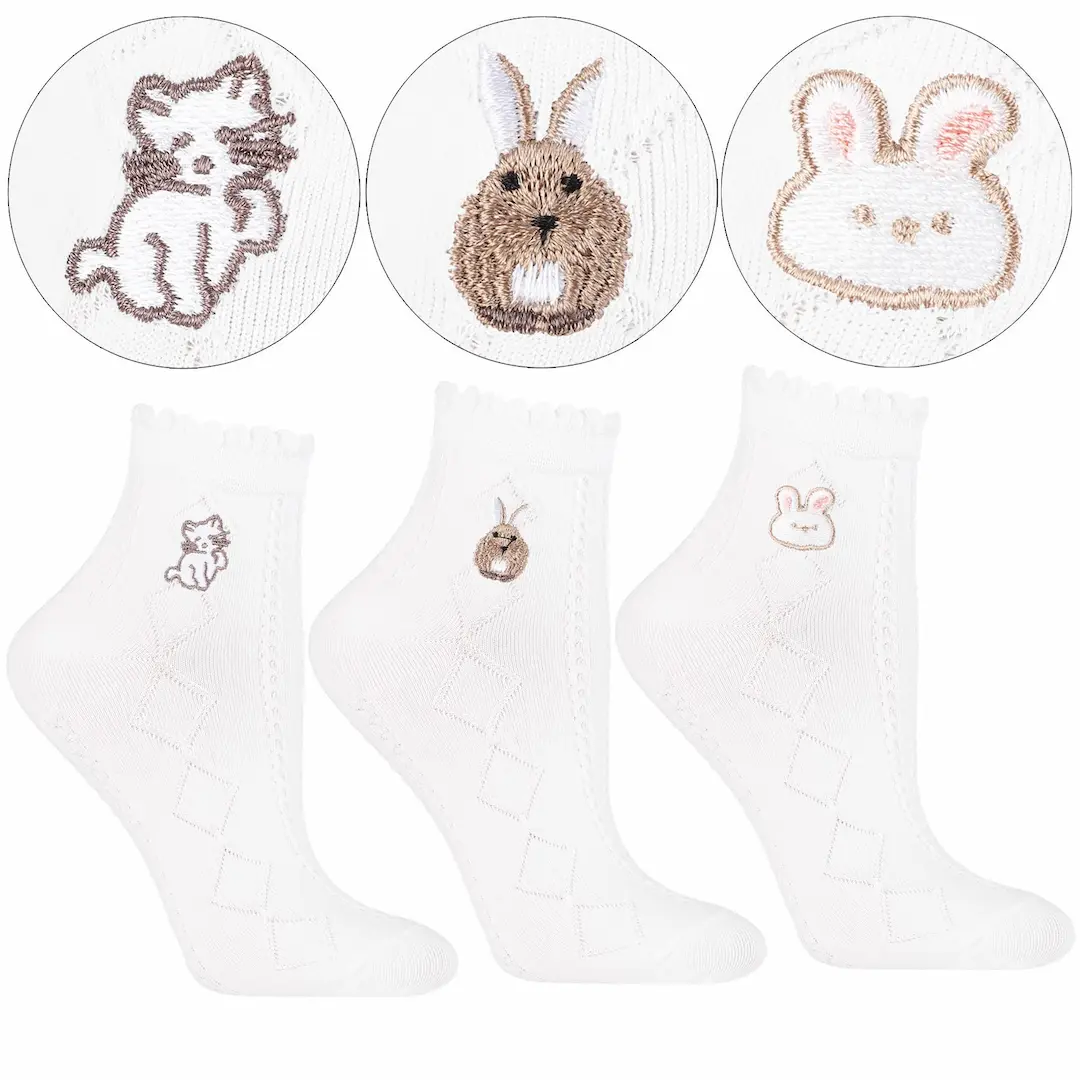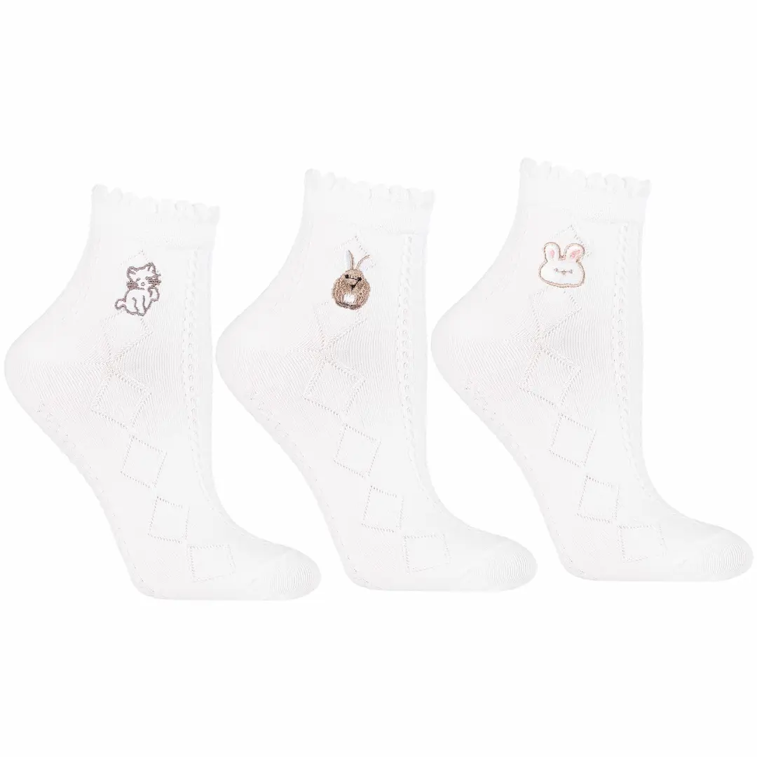 Zestaw 3 par białych skarpetek za kostkę to połączenie komfortu, jakości i dziewczęcego wdzięku. Każda para ozdobiona jest delikatnym haftem z motywem zwierząt, który dodaje im niepowtarzalnego charakteru.